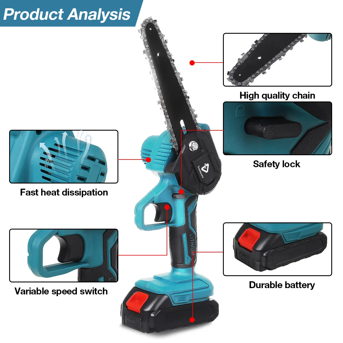 Особенности:-Беспроводная Привязка: Легкая наружная резка-Сильный двигатель: 4000 Вт, мощная мощность, длительный срок службы-Дизайн ручки: удобный захват, в соответствии с дизайном человеческого тела-Мощность литиевой батареи: Попрощайтесь с проблемой поиска источника питания-Простота в использовании: Нет необходимости разбирать, поверните винт, чтобы отрегулировать герметичность цепи-Безопасный двойной переключатель: Нажмите и удерживайте двойной переключатель, чтобы начать, нажмите и использовать, отпустите и остановите-Высококачественная направляющая цепь: острая износостойкая, глубокая закалка более износостойкая, гладкая резка-Шаг меньше переключения скорости: гуманизированный дизайн переключателя, регулировка скорости резки в соответствии с давлением-Эффективное рассеивание тепла: конструкция нескольких выпускных выходов на фюзеляже может эффективно предотвратить горение-Светильник весовой фюзеляж: светильник, портативный, с одной рукой, удобно держать, не уставать, чтобы держать в течение длительного времени-Четыре интеллектуальных функции защиты: защита от перегрузки по току, защита от перенапряжения, защита от перегрева, защита от зарядки и разрядки