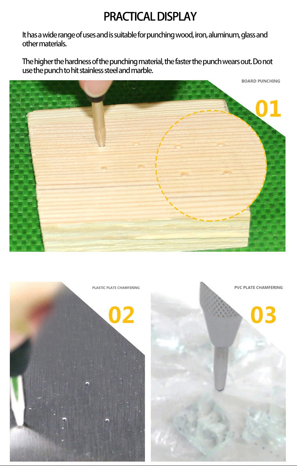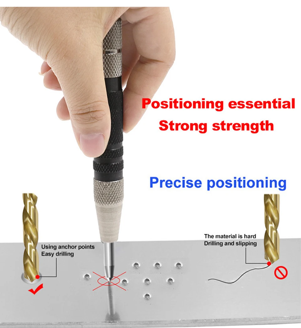 1. Этот вид центрального перфоратора подходит для позиционирования при пробивке, обеспечивая вам сильную ударную силу, что делает вашу работу более удобной.2. Стальной центральный перфоратор крепкий и не легко деформируется, а противоскользящее зерно удобно держать и контролировать удар, подходит для обычной стальной доски, деревянной доски, железная доска и другие материалы.3. Кроме того, этот центральный перфоратор может быть использован в качестве аварийного инструмента, когда Вы застреваете в машине, легко выживаете.4. Есть несколько типов для выбора, и в некоторых посылка есть запасные головки, вы можете заказать в соответствии с вашими потребностями.5. Этот центральный перфоратор прост в использовании без других инструментов, вам просто нужно выровнять точку позиционирования и нажать на руку, чтобы ударить. После того, как удар прижат обратно к небольшой части стержня, сильная пружина будет энергично выскакивать удар, производя яму для точки.
