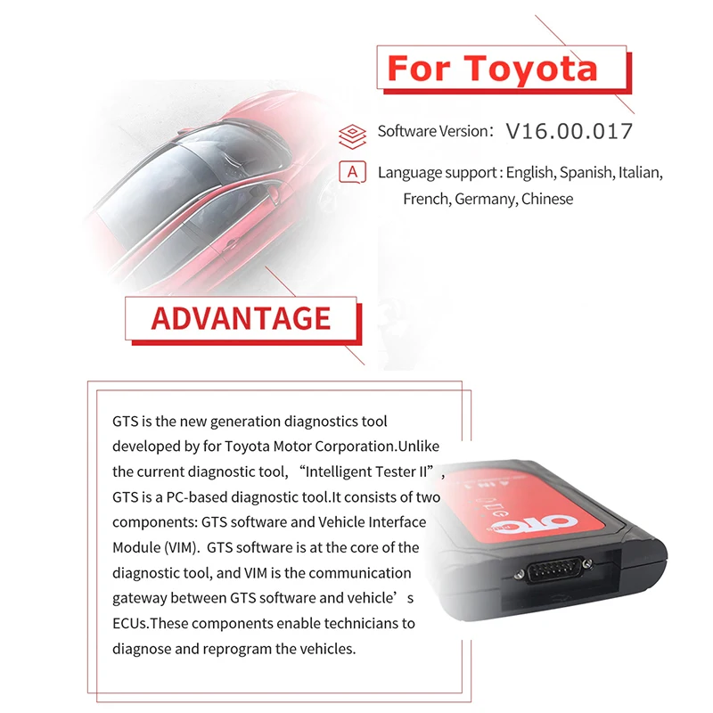 Он состоит из двух компонентов: программного обеспечения GTS и модуля интерфейса транспортного средства (VIM). Программное обеспечение GTS является ядром диагностического инструмента, а VIM-шлюз связи между программным обеспечением GTS и ECUs транспортного средства. Эти компоненты позволяют техникам диагностировать и перепрограммировать транспортные средства.
