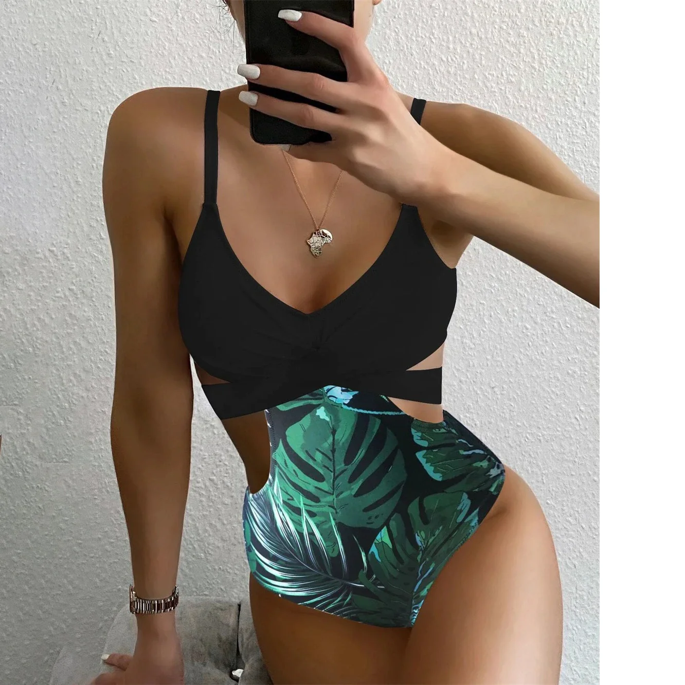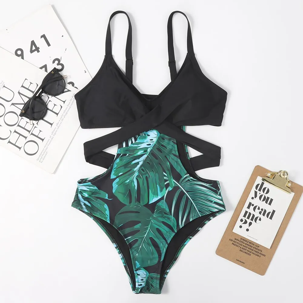 Женский слитный купальник, привлекательный купальник-трикини с перекрестными лямками, купальный костюм с высокой талией, купальник с принтом листьев, 2022, пляжный купальный костюм