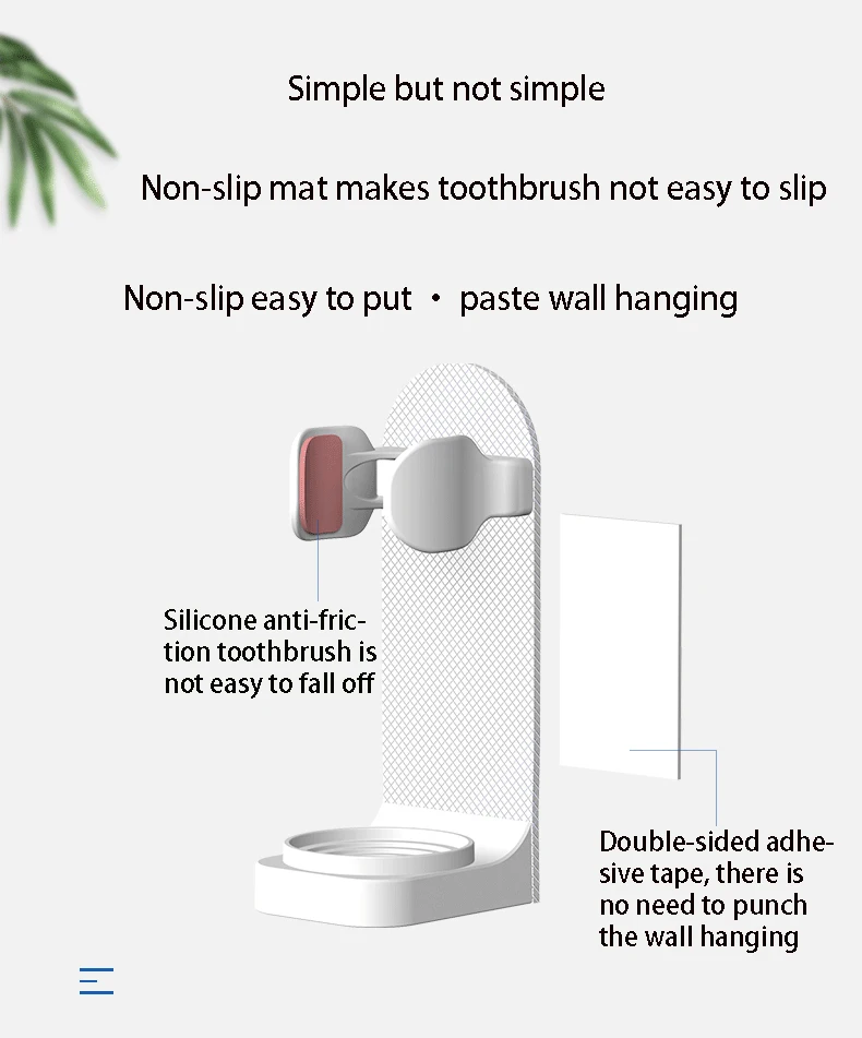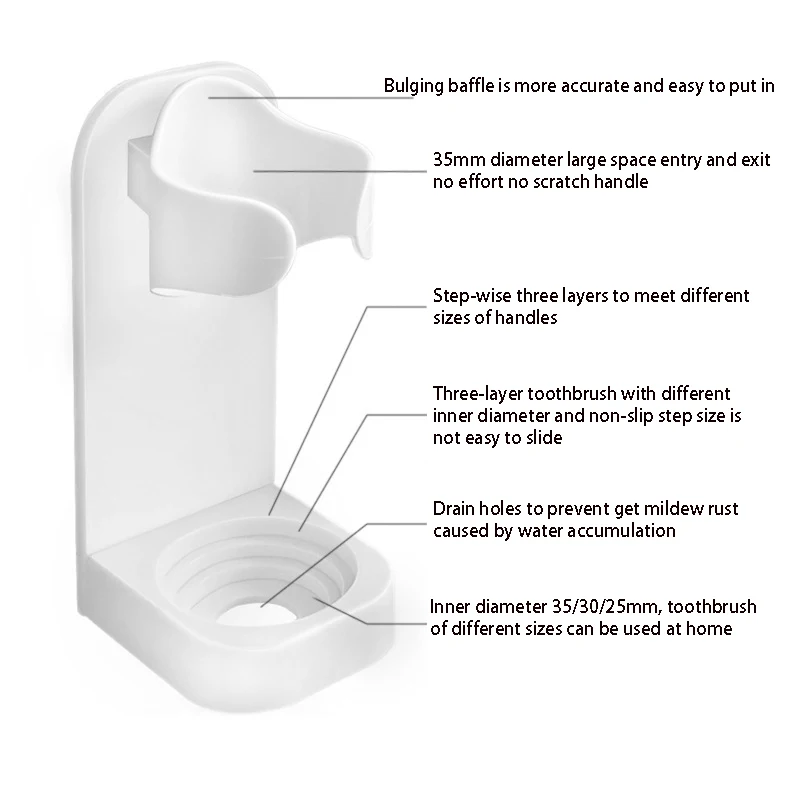 Материал: АБС-пластикРазмер: 9,5х3 смЦвет: белый, черный, синий, розовыйПодходит для 98% электрической зубной щеткиПосылка включает в себя: 1 шт./3 шт. x Держатель для электрической зубной щеткиХарактеристикиДержите зубную щетку сухой и избегайте микробов.Портативный дизайн, компактный и легкий, простой в использовании.3 м пасты, установка без потерь.Место для зарядки кабеля.Нижняя часть изделия спроектирована с выходом для воды.Примечание:1. Для мрамора, плитки, стекла, матовой поверхности, дерева, окрашивания, металла, Античного кирпича.2. Только держатель зубной щетки, другие (зубная щетка) не включены.