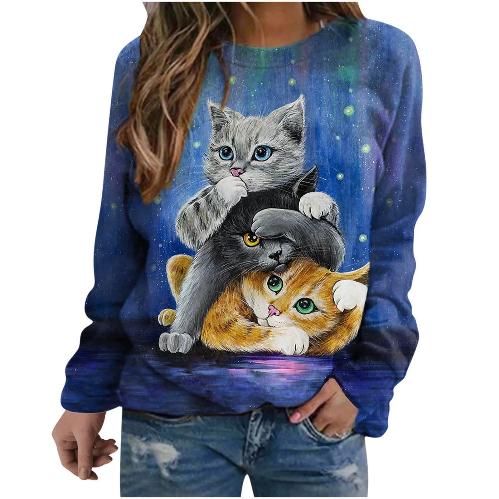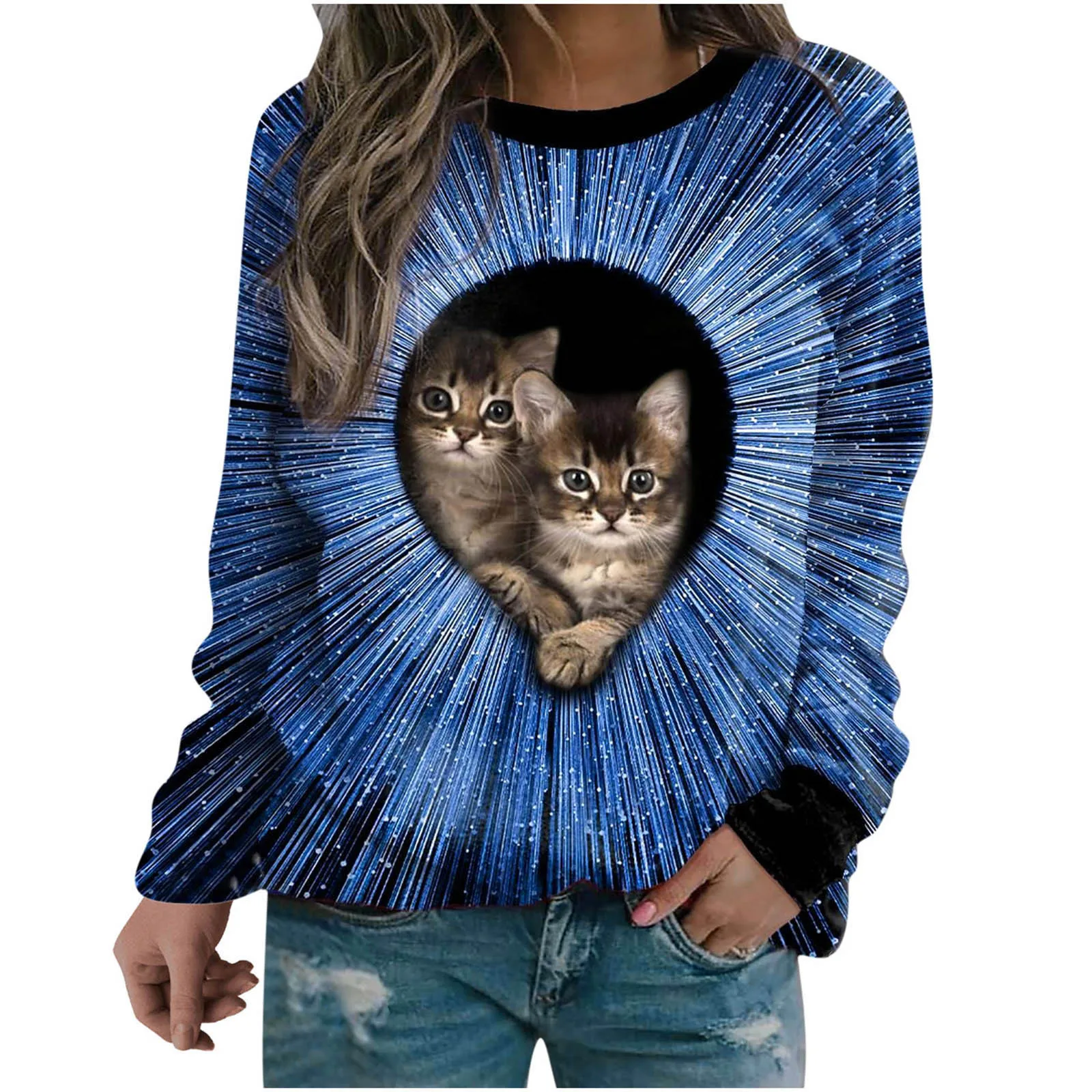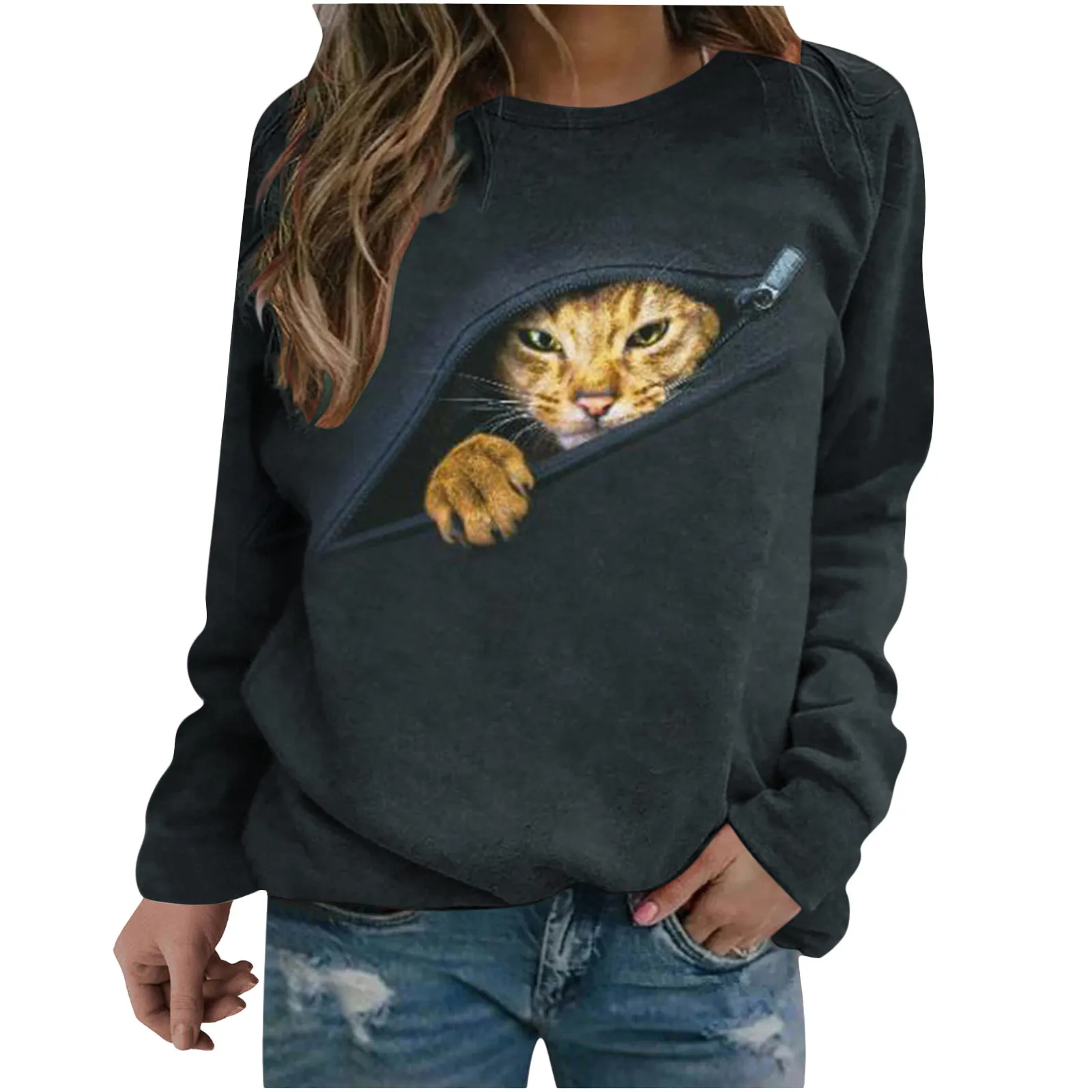Женские рубашки с длинным рукавом, Футболка с принтом животного, кота, свитшот с круглым вырезом, пуловер, удобные топы, новинка весны 2022