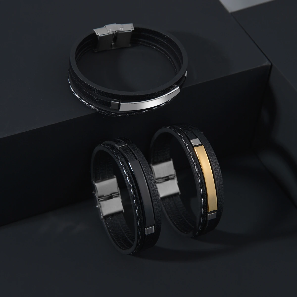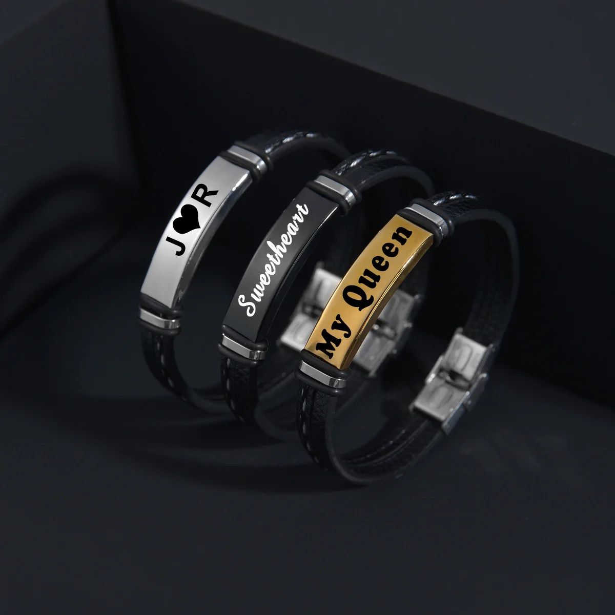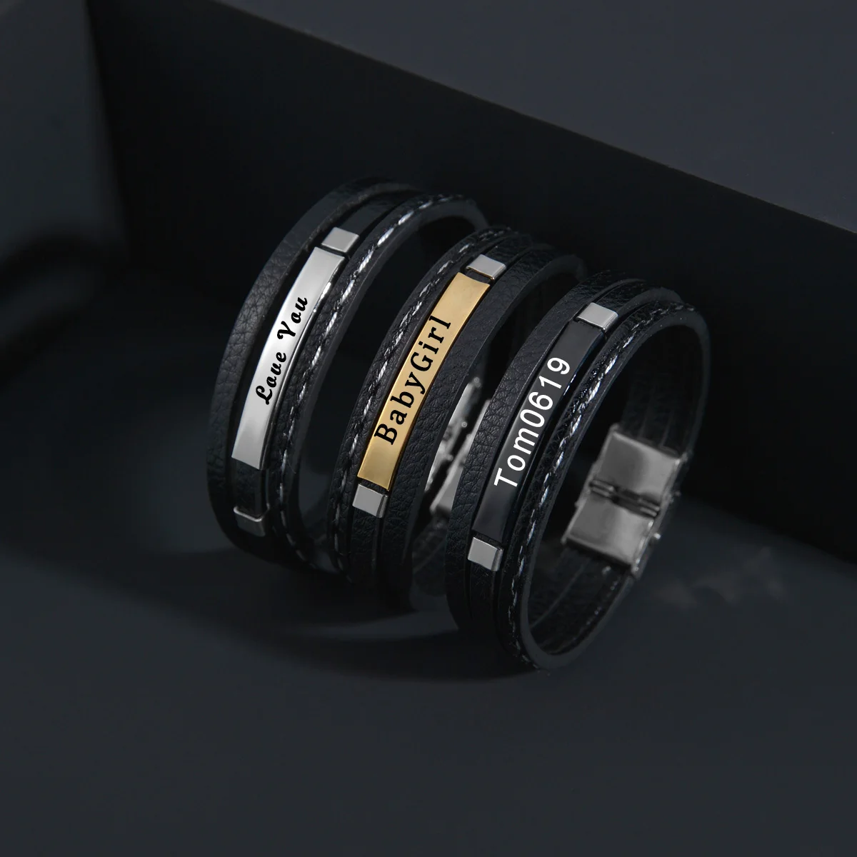 Название:Goxijite персонализированный именной браслет для женщин из нержавеющей стали на заказ Гравировка символ даты черные кожаные браслеты праздничный подарок
