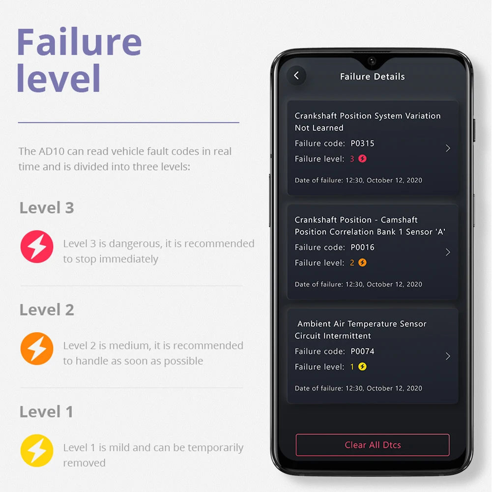 * 2. Автоматическое определение автомобиля, считывание кода ошибки автомобиля в режиме реального времени и разделение кодов ошибок на три уровня, 1. Может держать накопитель; 2. Пожалуйста, попытайтесь исправить это как можно скорее; 3. Пожалуйста, остановите его и найдите решения, предоставьте профессиональные предложения по ремонту после прочтения кода неисправности (как отремонтировать).