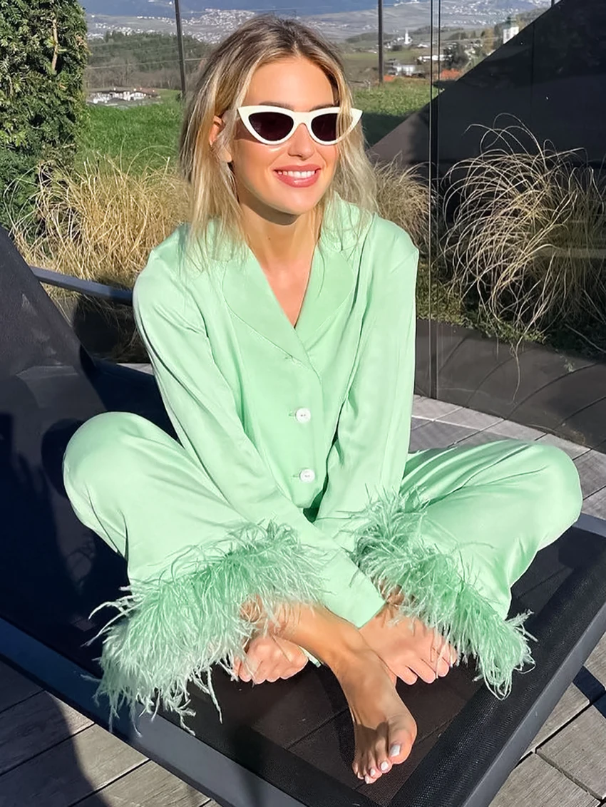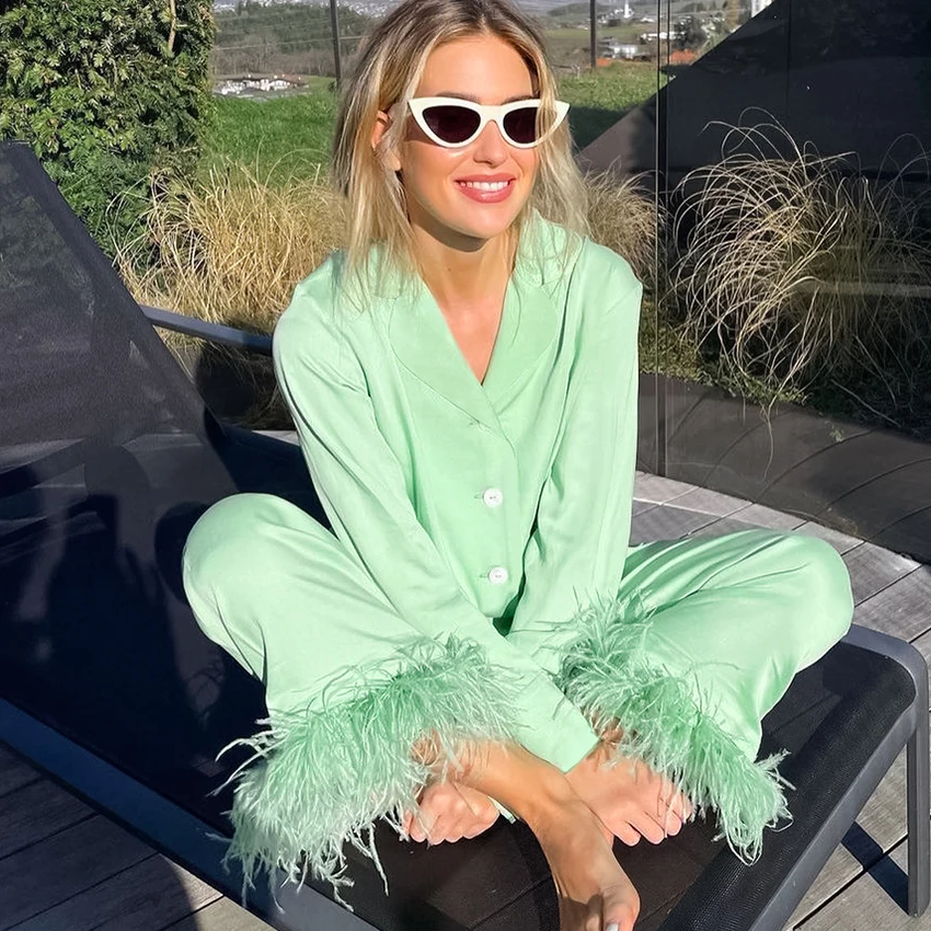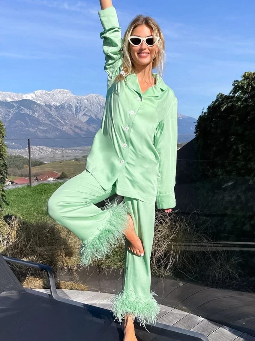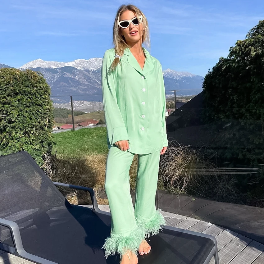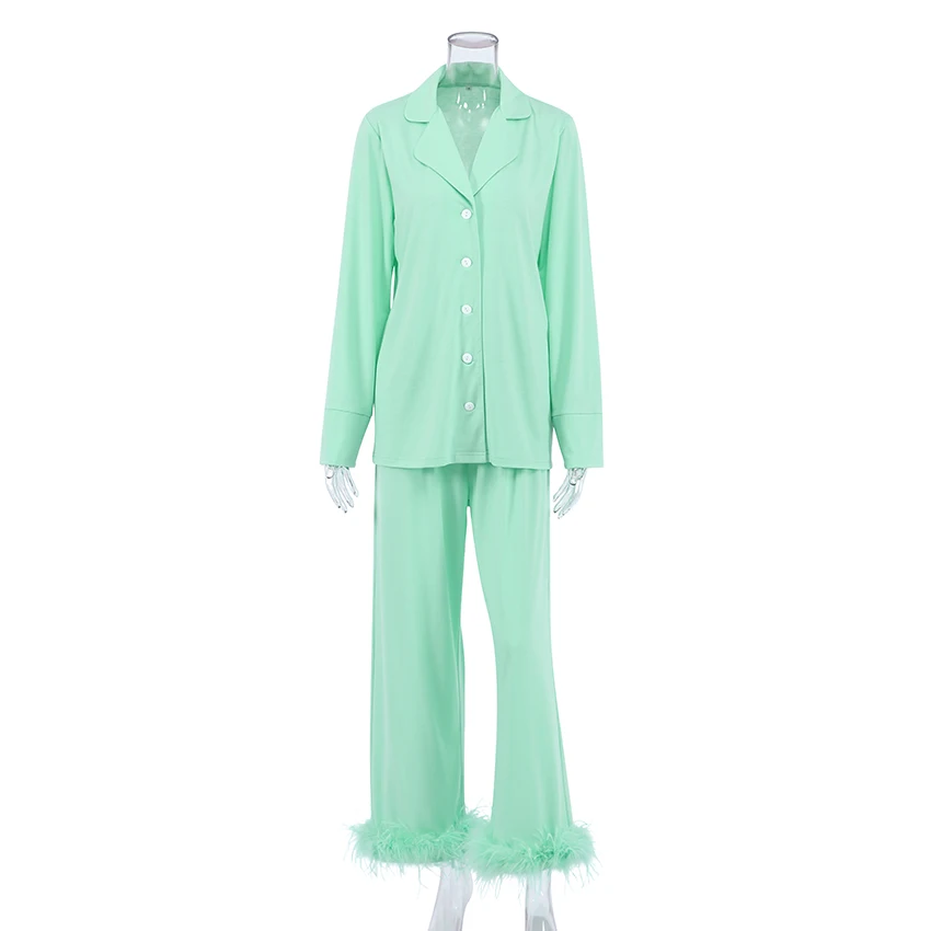 Пижама с перьями Restve для женщин, комплект из 2 предметов, Зеленый Топ с длинным рукавом и отложным воротником, вязаные женские комплекты с брюками, повседневные 2022