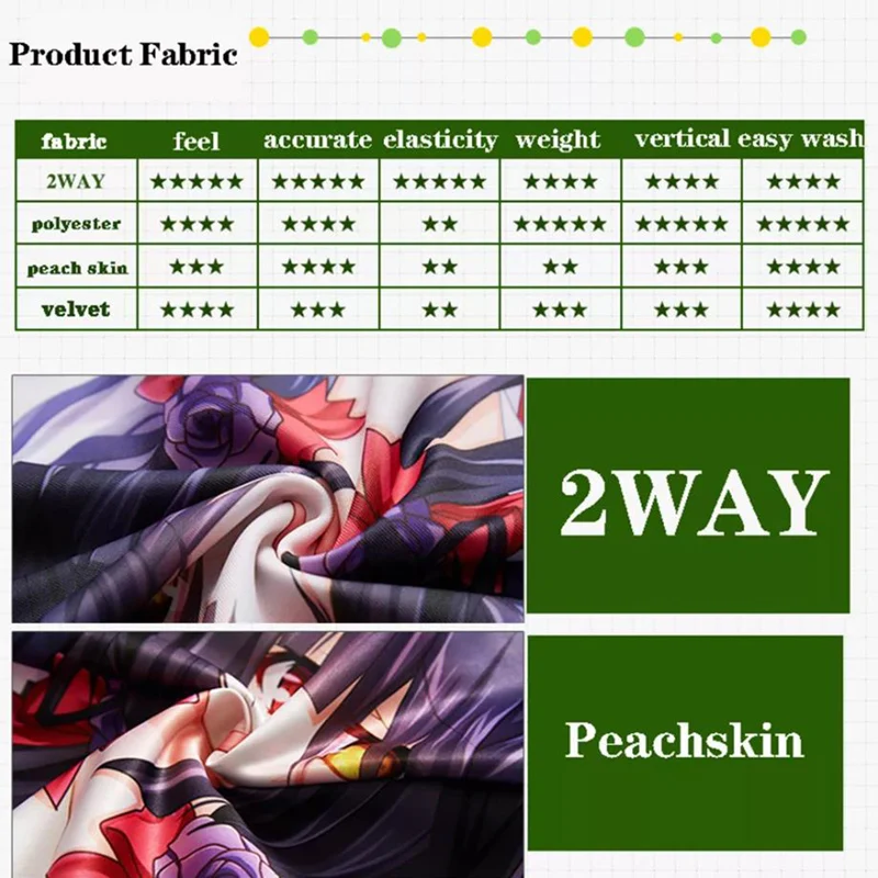 I bought two of these dakimakuras and was kind of disappointed, the ones I received were not true peach skin fabric but more of a linen or cotton like fabric so it doesn't have that silky feel of true peach skin fabric. It also affects the quality of the image on the pillowcase, they weren't blurry but they weren't as sharp and defined as other ones I've bought before. Over-all they weren't bad for the price but not as good as ones I've gotten from other dealers on here.