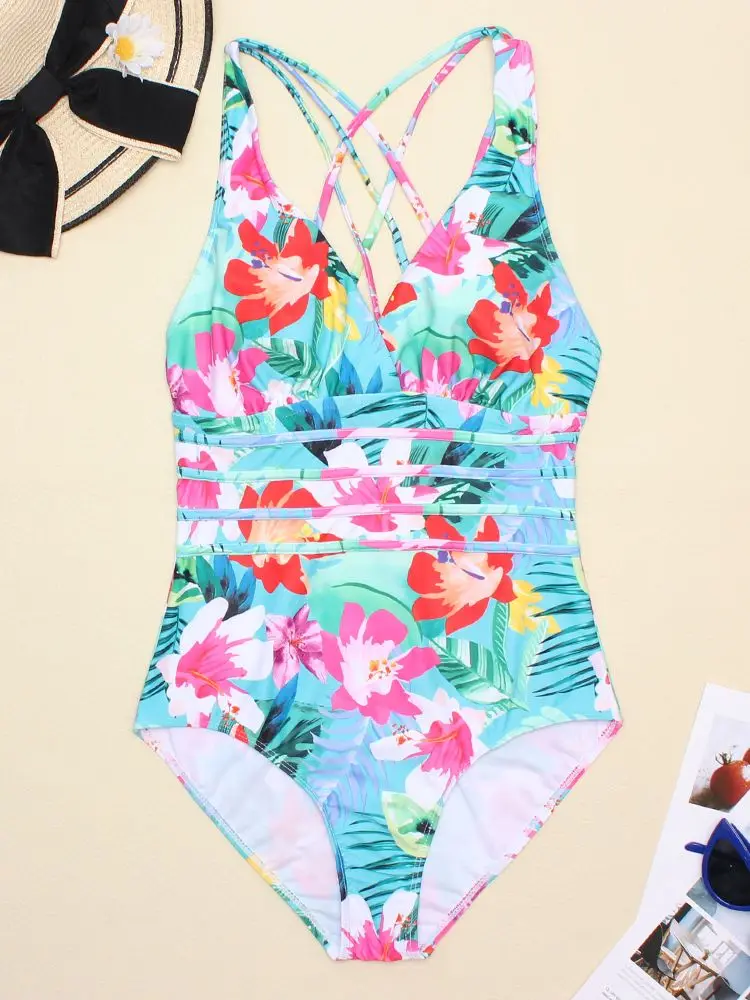 Женский слитный купальник Gossina, бандажный купальник с цветочным принтом и V-образным вырезом, пляжные купальные костюмы 2022, женские бикини