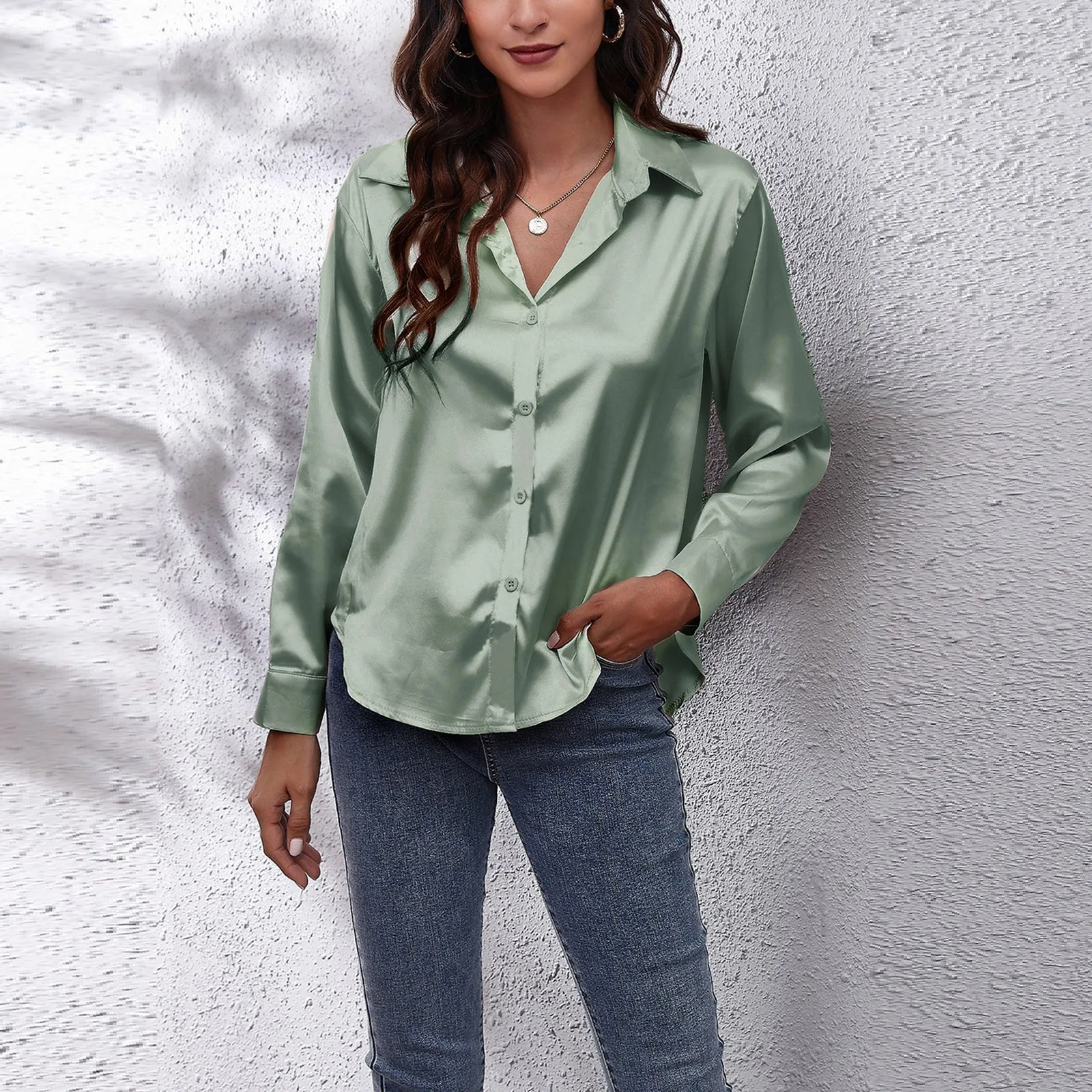 Plus Size Woman ClothingGreen Button Up Silk Shirts