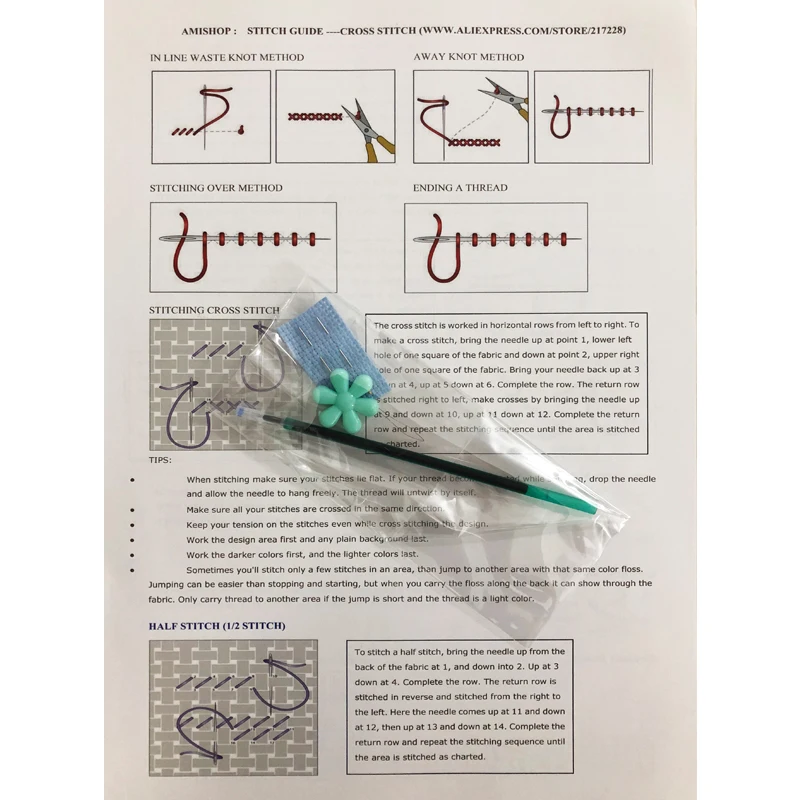 100% хлопковая нить, холст Aida, иглы, бумажная Таблица (Инструкция на английском языке, цветная печать, размер А4/страница)
