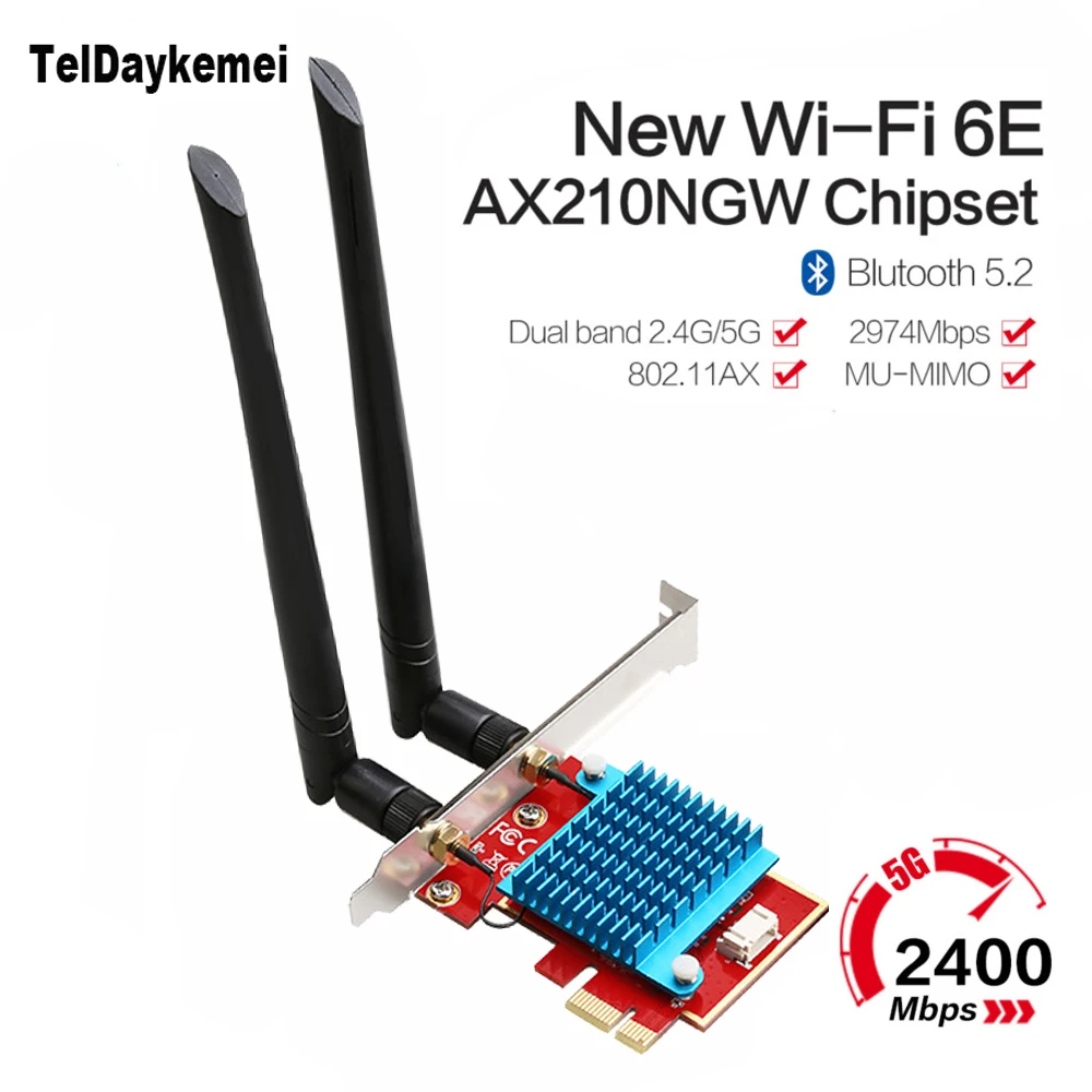 Chipest: чипсет Intel AX210;Новый Wi-Fi 6E с Blutetooth 5,2;Стандарт IEEE: 802.11ax/ac/a/b/g/n;Двухдиапазонный 2,4 ГГц-300 Мбит/с/5Ghz-2400Mbps;Примечание: скорость до 2400 Мбит/с (маршрутизатор должен поддерживать 802.11ax);Поддержка MU-MIMO;Операционные системы: Поддержка только Windows 10*64 бит и Linux;Совместимость с: почти компьютером с PCI Express (разъем PCI-E 1X/4X/16X);Антенны с высоким коэффициентом усиления 6DBi обеспечивают лучший прием сигнала.