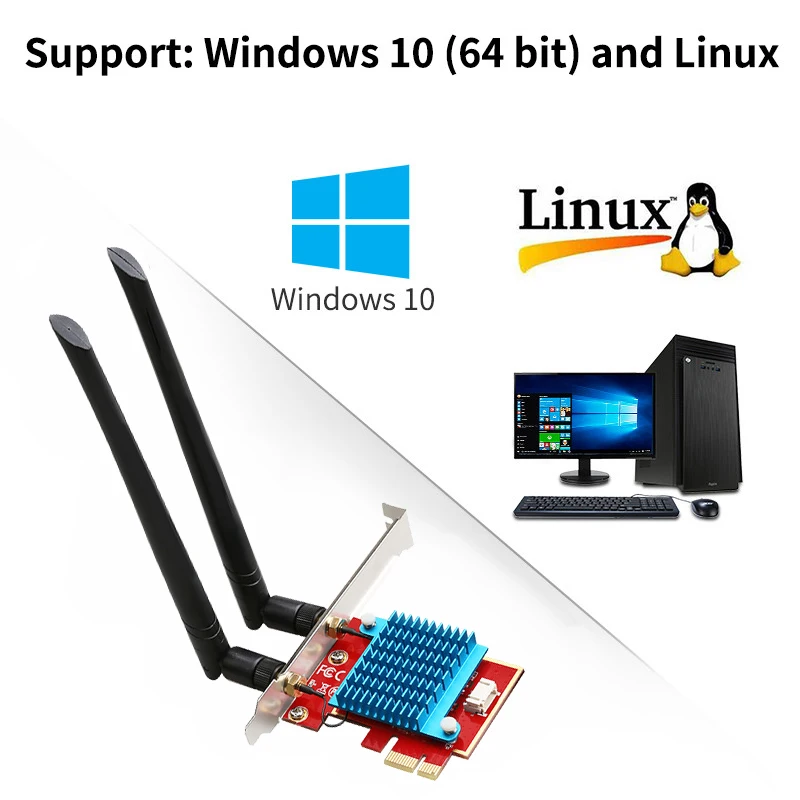 2,4 ГГц-574 Мбит/с 5GHz-1200MbpsМаксимальная скорость: скорость до 1200 Мбит/с (маршрутизатор должен быть на 80 МГц)Версия Bluetooth: Bluetooth 5,2Интерфейс: PCI-E.Антенна: 5DBi.Поддерживаемые операционные системы: работает только с Microsoft Windows 10 /11 64 bit.Примечание: не поддерживает Windows 7/8/8.1
