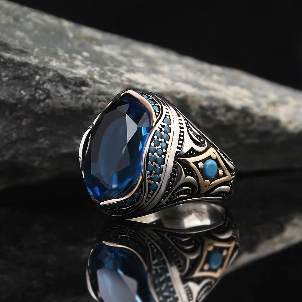 Мужское кольцо из серебра, покрытое драгоценным камнем с голубым то...