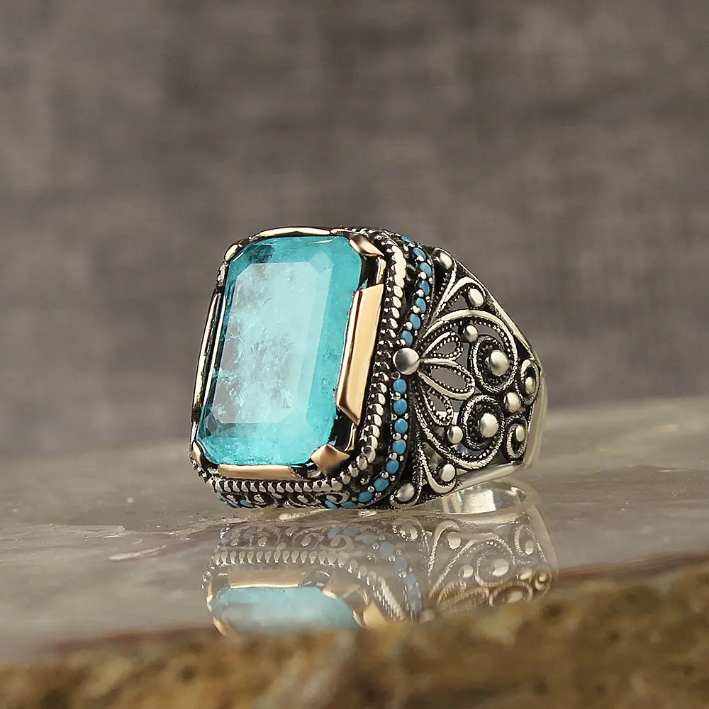 Мужское бриллиантовое серебряное кольцо Paraiba с кубическим цирконием, подарочное изделие, Модный Специальный дизайн ручной работы, Сделано в Турции