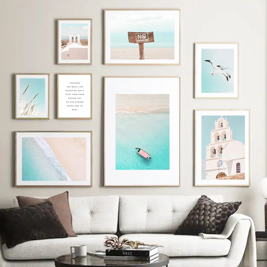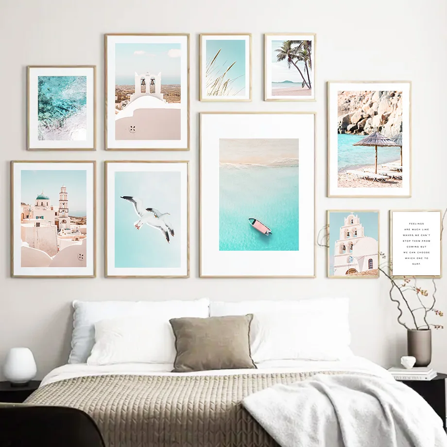 Настенная картина синее море Пляж Лодка церковь Пальма птица холст картины скандинавские плакаты и принты настенные картины для декора гостиной