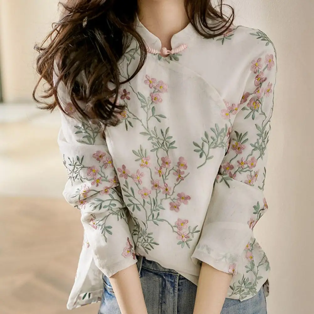 Женская рубашка в китайском стиле, рубашка из хлопка и льна в стиле ретро, блузка в китайском стиле Ципао с воротником-стойкой и вышивкой на пуговицах для весны и лета