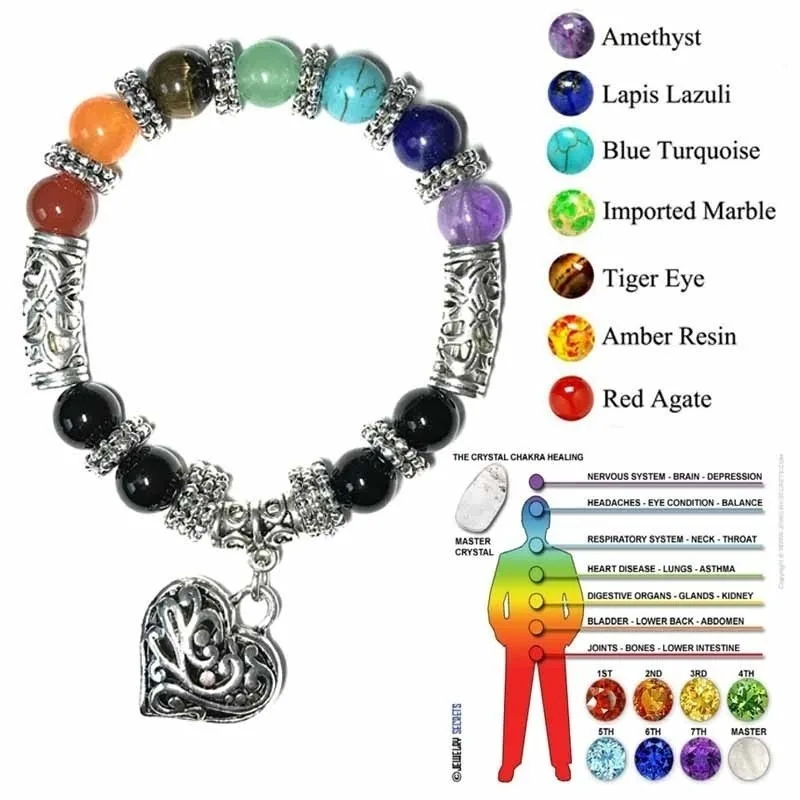 Новые женские браслеты 8 мм, браслеты, 7 чакр, Исцеляющие балансирующие бусины, очаровательный браслет с сердцем для женщин, молитвенные камни, ювелирные изделия, подарки