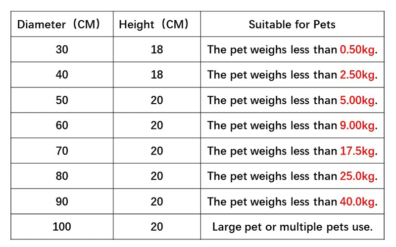 Общие для кошек и собак30 см: подходит для домашних животных менее 0,5 кг40 см: подходит для домашних животных менее 2,5 кг50 см: подходит для домашних животных менее 5,0 кг60 см: подходит для домашних животных менее 9,0 кг70 см: подходит для домашних животных менее 17,5 КГ80 см: подходит для домашних животных весом менее 25,0 кг90 см: подходит для домашних животных весом менее 40,0 кг.Возможны отклонения на 3-5 см из-за ручного измерения. Размеры относятся к внешнему диаметру кровати для домашних животных, включая длинный плюш.