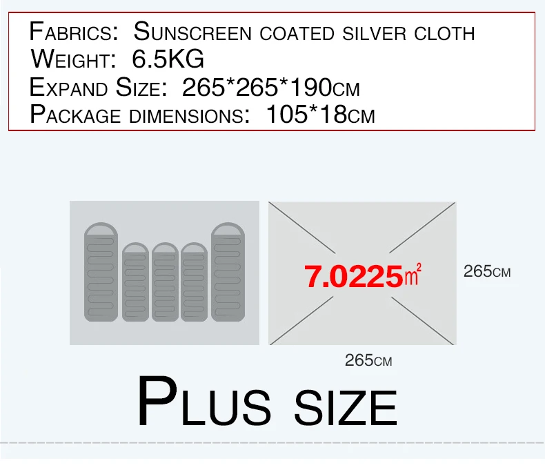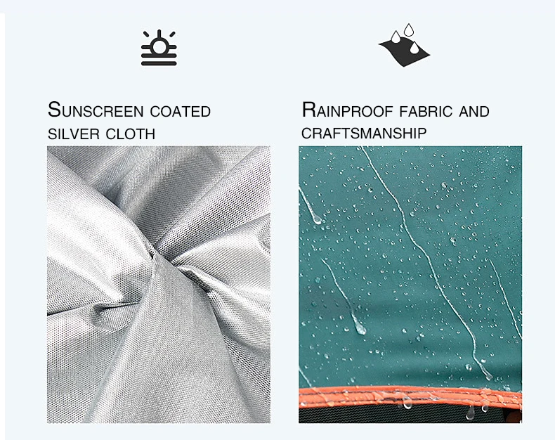Внешняя учётная запись сделана из ткани Оксфорд 210D, которая достаточно износостойкая, как материал палатки, которая достаточно, чтобы удовлетворить ваши потребности отдыха и кемпинга от дождя. Серебряное солнцезащитное покрытие добавляется внутрь, улучшенное серебряное покрытие оптимизировано по толщине, то есть Он защищен. Эффективное затенение и анти-ультрафиолетовое действие под солнцем не вызовет проблемы с знойным нагревом из-за чрезмерной толщины.