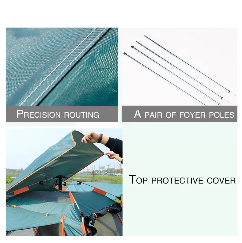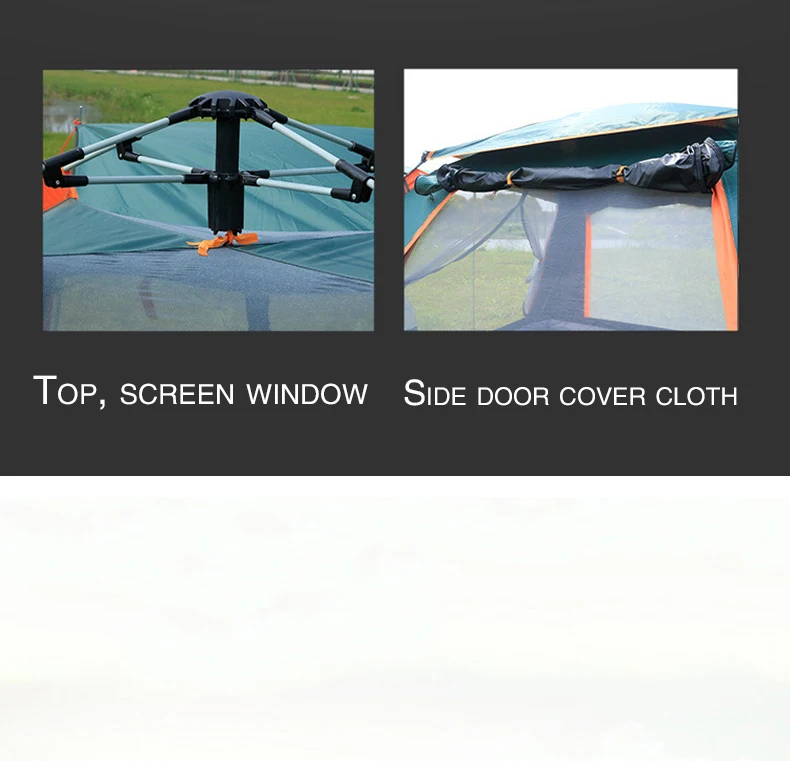 ● Прочный складной шарнир ABS● Четыре угла прибиваются● Точная маршрутизация Тернера● Представляем пару столбиков для зала● Верхняя Защитная крышка:Эта модель добавляет верхнюю защитную крышку, которая сотрудничает с экранами на верхней части палатки, которая не только обеспечивает вентиляцию, но и играет роль ветра и дождя.