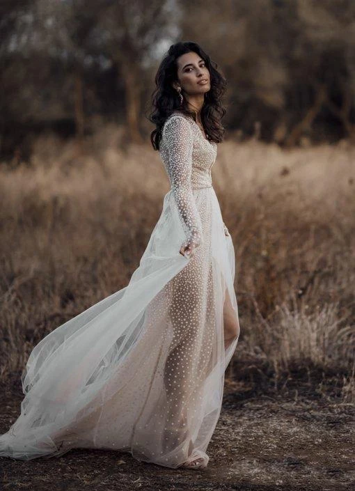 Пляжное свадебное платье LUOJO с длинным рукавом, Боковой разрез, трапециевидный вырез, v-образный вырез, иллюзия, тюль, богемный стиль, свадебные платья, женское