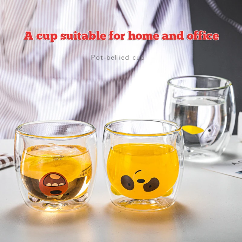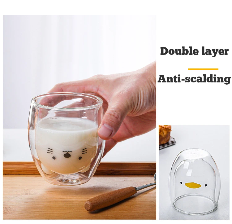 Двухслойные Стеклянные Кружки, антиобжигающая Милая чашка с животными, чайная чашка, молочная чашка для лимонного сока, посуда для напитков, Детская любимая кавайная кофейная кружка Gif