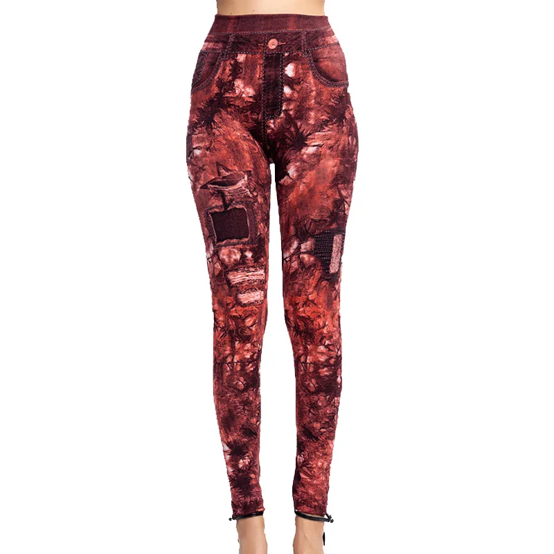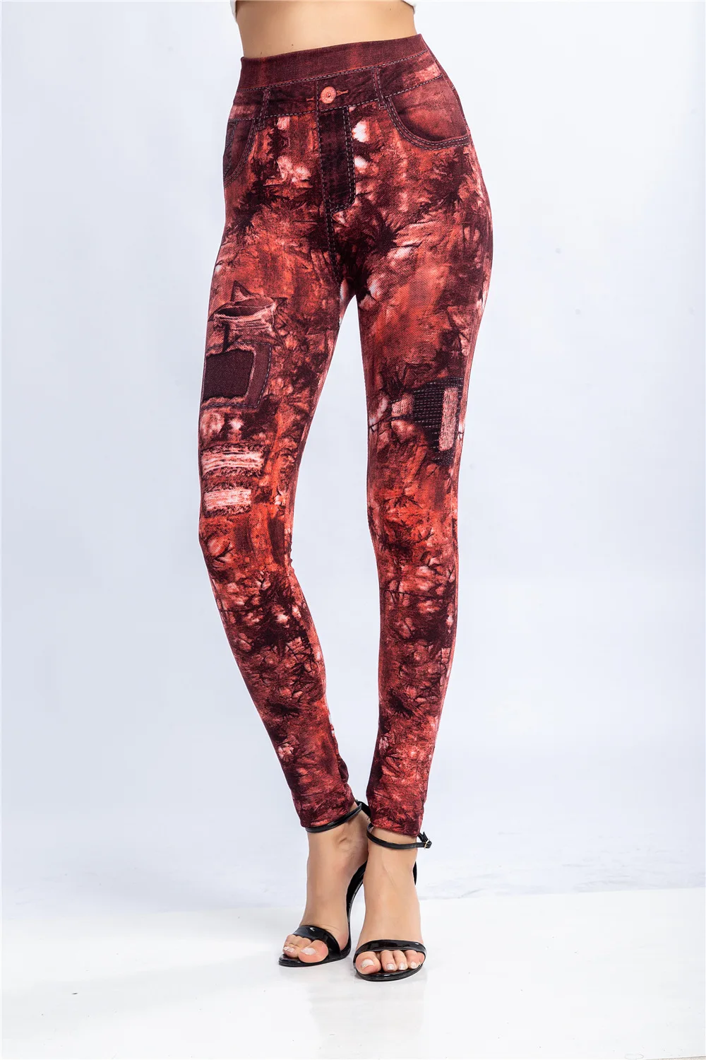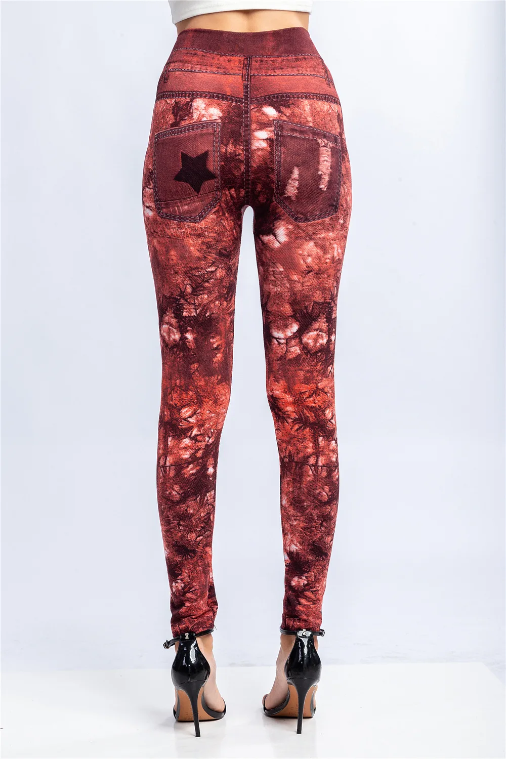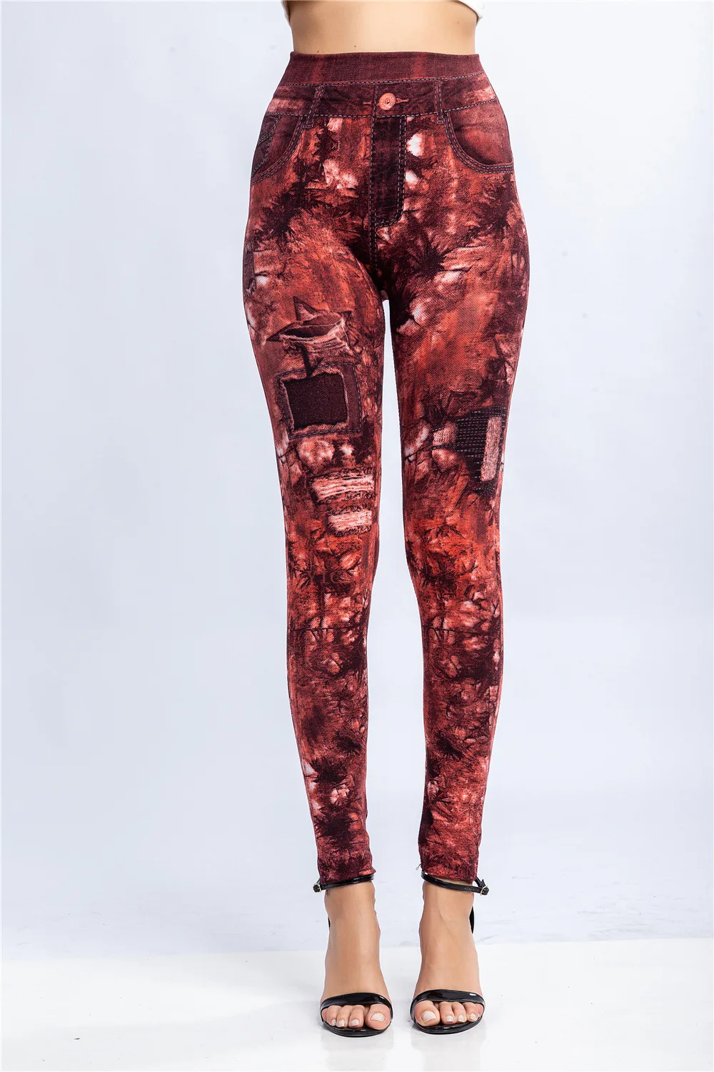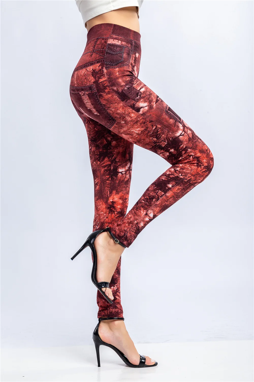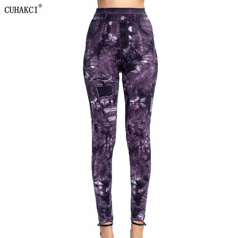 Облегающие женские леггинсы CUHAKCI из искусственной джинсовой ткани, эластичные штаны с высокой талией для фитнеса, спорта, тренировок, бега, штаны с принтом листьев и пуш-ап