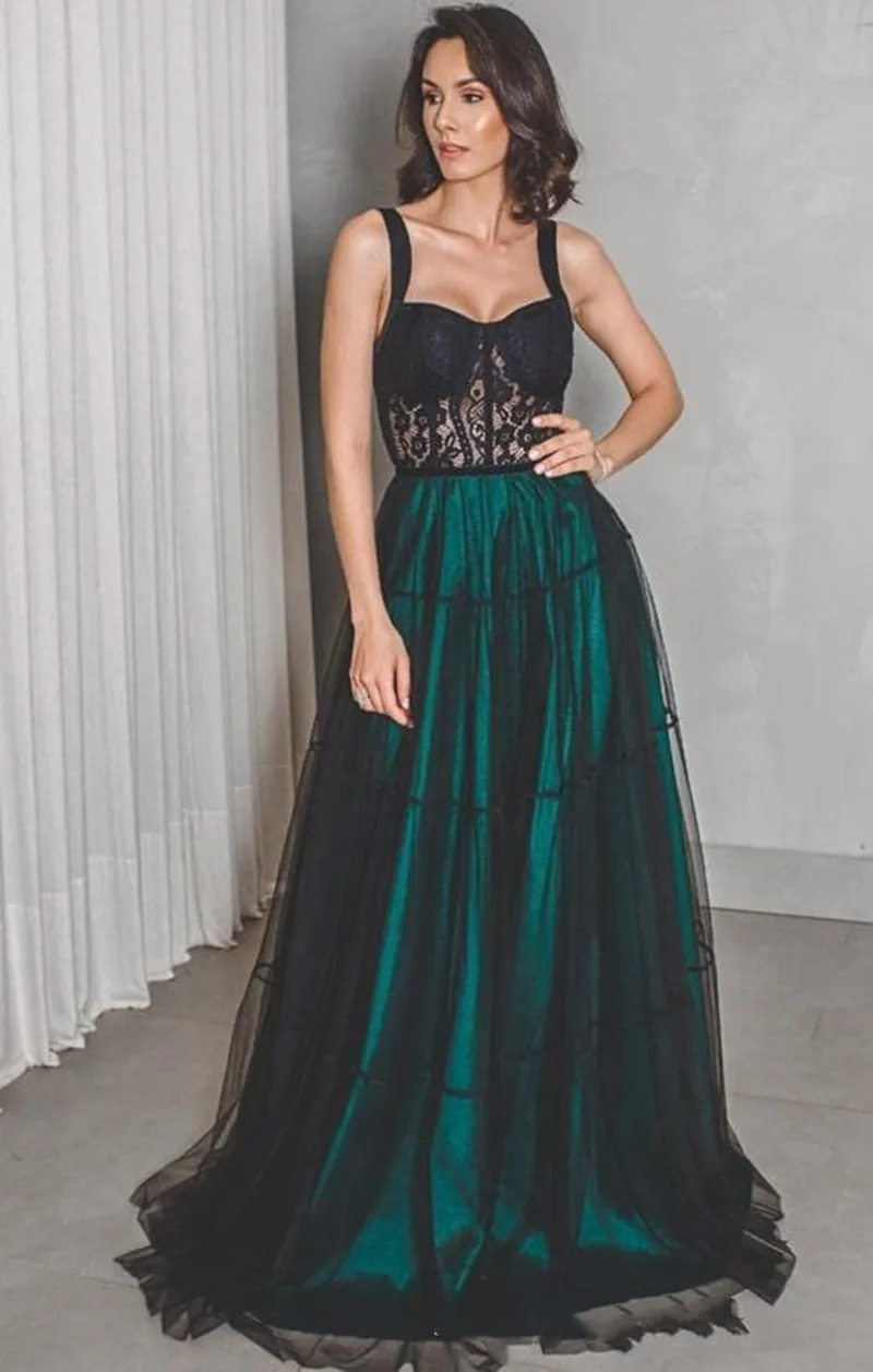 Черно-зеленое ТРАПЕЦИЕВИДНОЕ Тюлевое платье для выпускного вечера кружевной топ на бретелях-спагетти с сердечком вечерние платья для женщин длинное платье горничной Honor Vestido