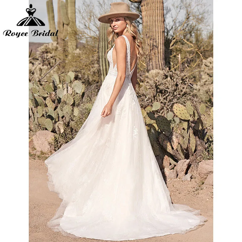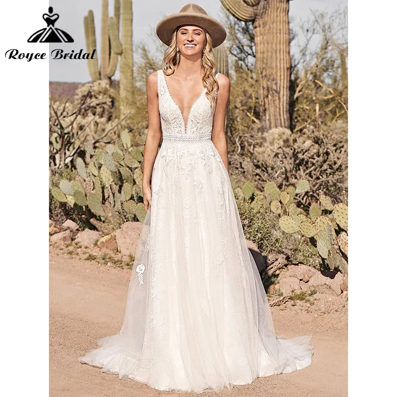Пляжное свадебное платье А-силуэта без рукавов с глубоким V-образным вырезом