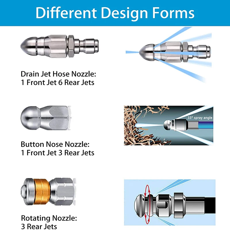 【Прочный материал 】 Это вращающееся носовое Канализационное струйное сопло изготовлено из нержавеющей стали, которое может эффективно противостоять ржавчине и гниению, оно может обеспечить долгосрочное применение для вас, струйное сопло рабочее давление до 5000 PSI и может выдерживать температуру горячей воды до 310 градусов по Фаренгейту