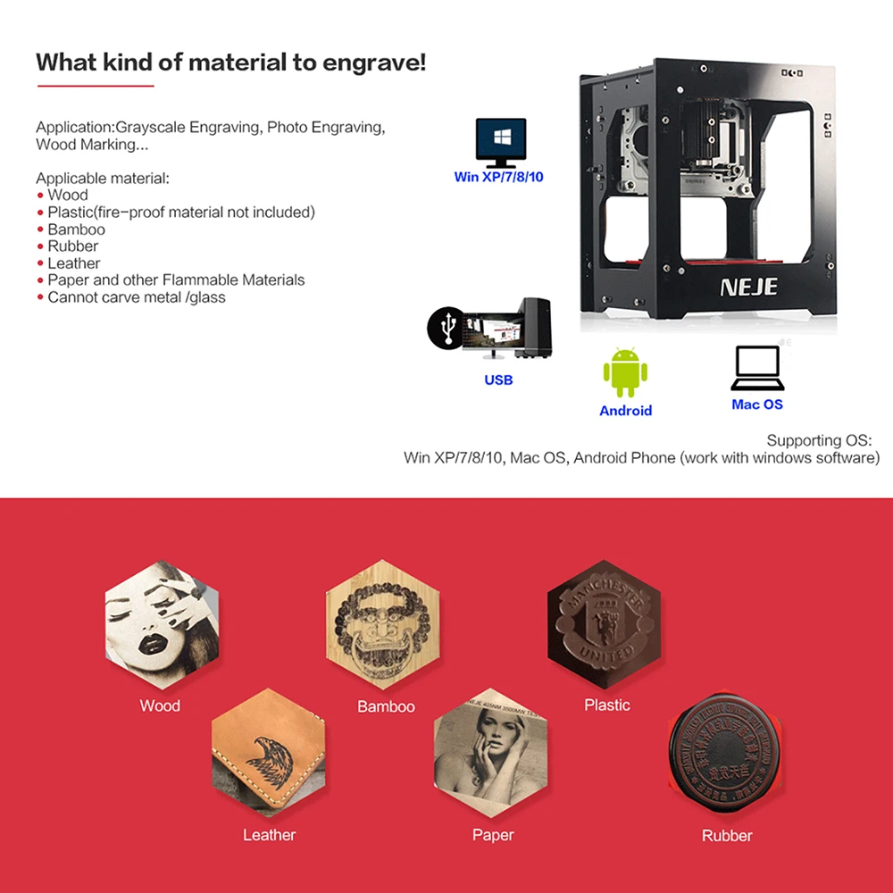 Изделия могут быть вырезаны, в том числе: красное дерево, бамбук, бумажные карты, слоновая кость, кожа, легковоспламеняющийся пластик, PCBA и т. Д.