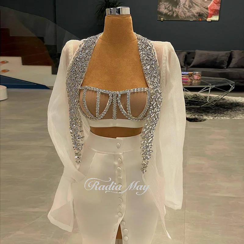 Женское платье-Русалка с длинным шлейфом Radia, белое вечернее платье с жакетом и высоким разрезом, украшенное стразами, для выпускного вечера, 2 шт.