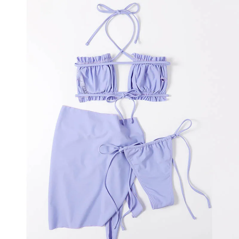 INGAGA сексуальное бикини бандо, купальник из 3 частей с юбкой, купальник с лямкой на шее, Женская однотонная Пляжная накидка 2022, купальные костюмы с оборками