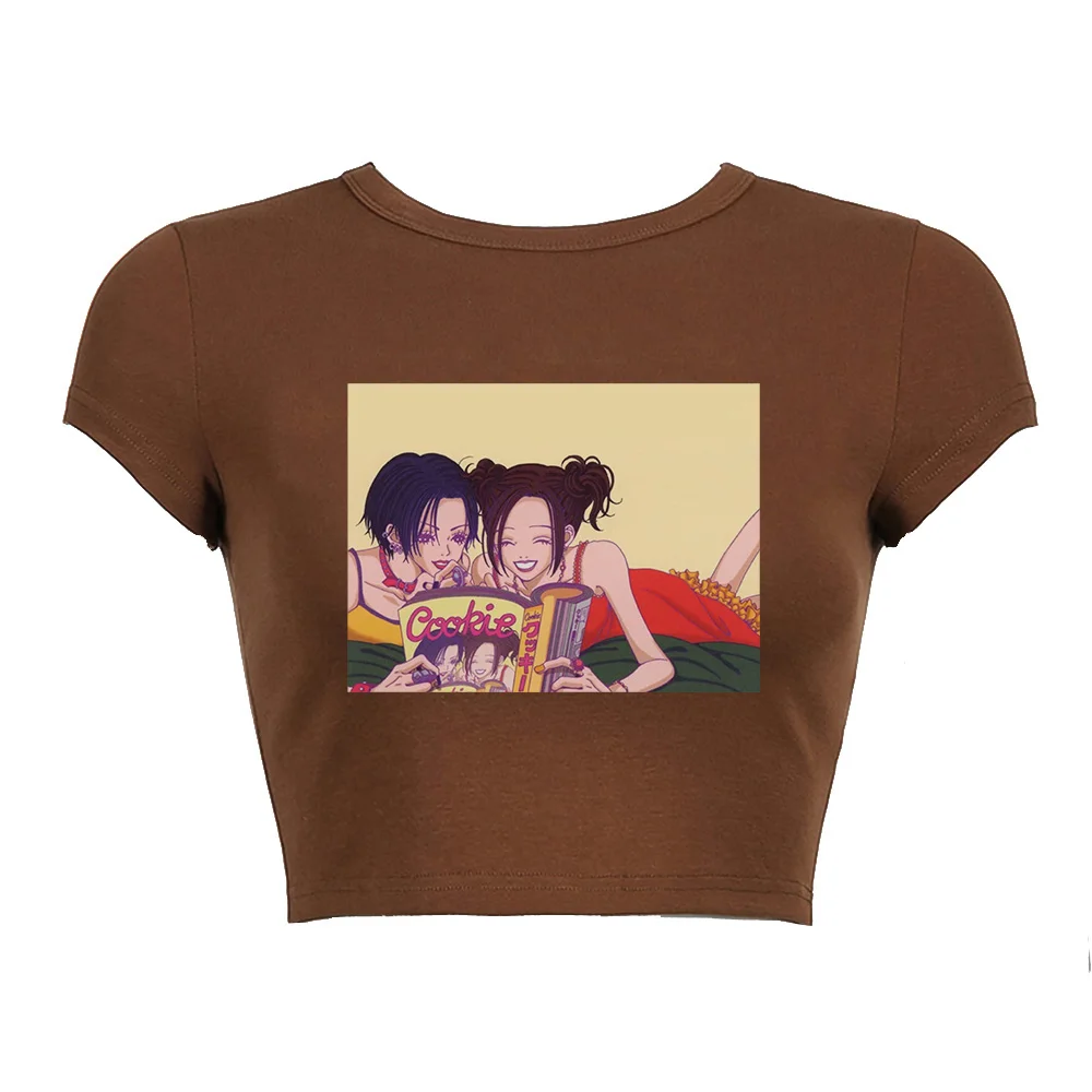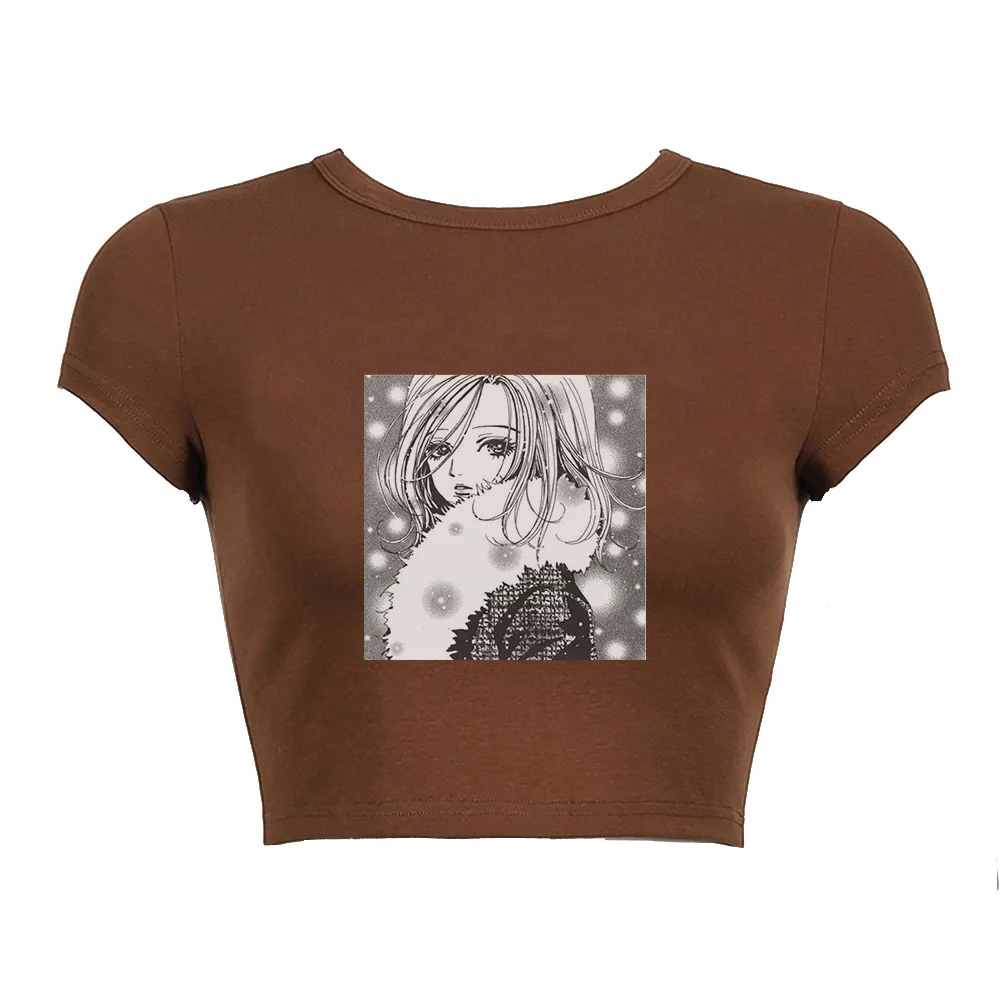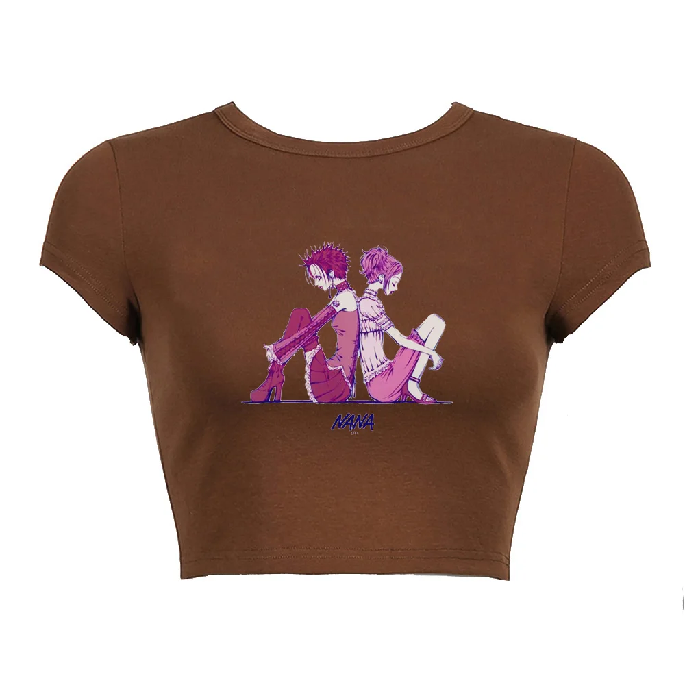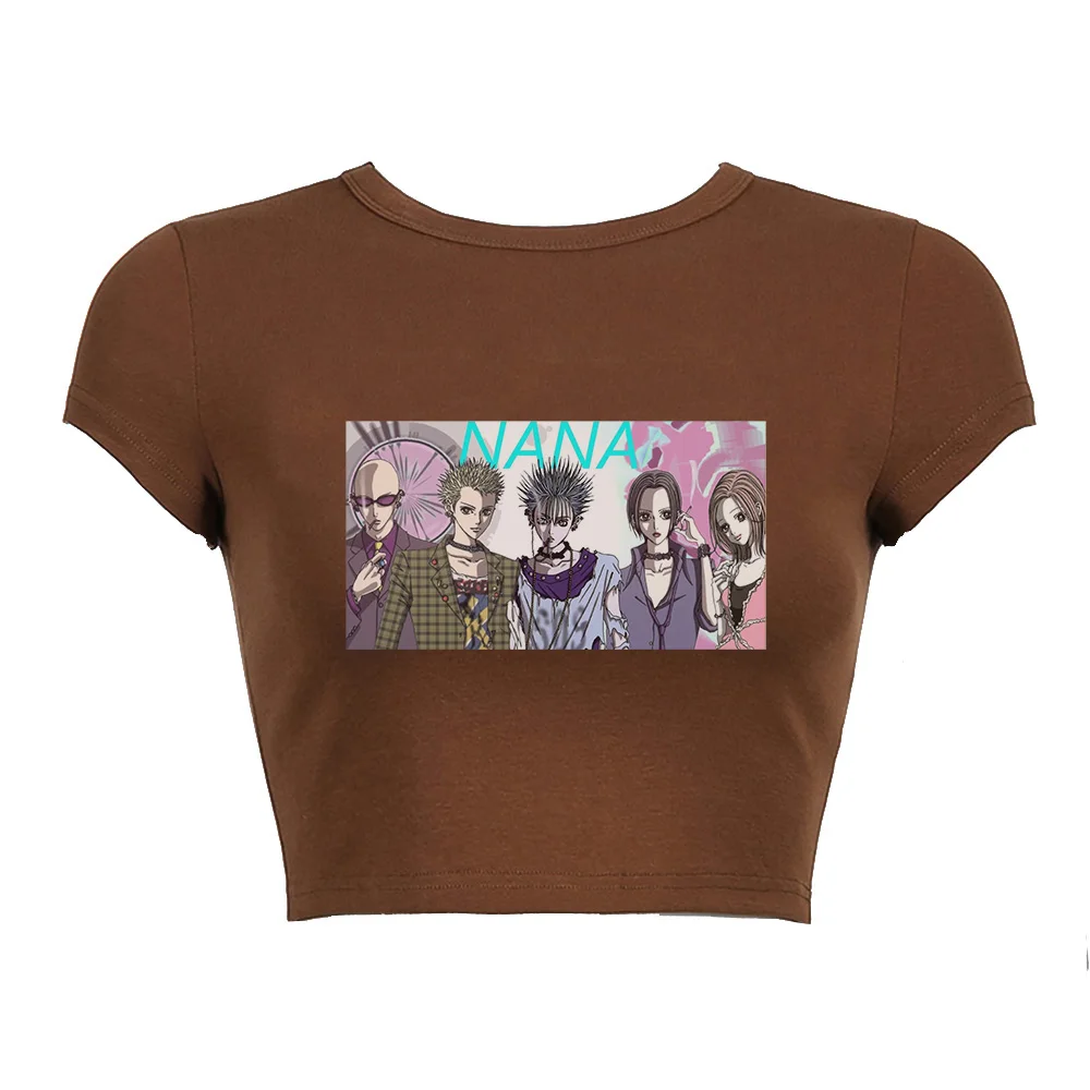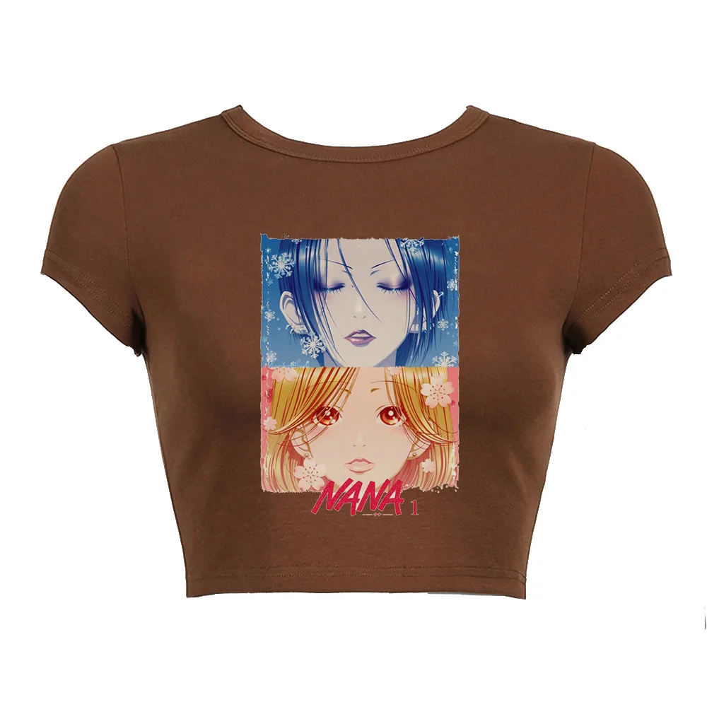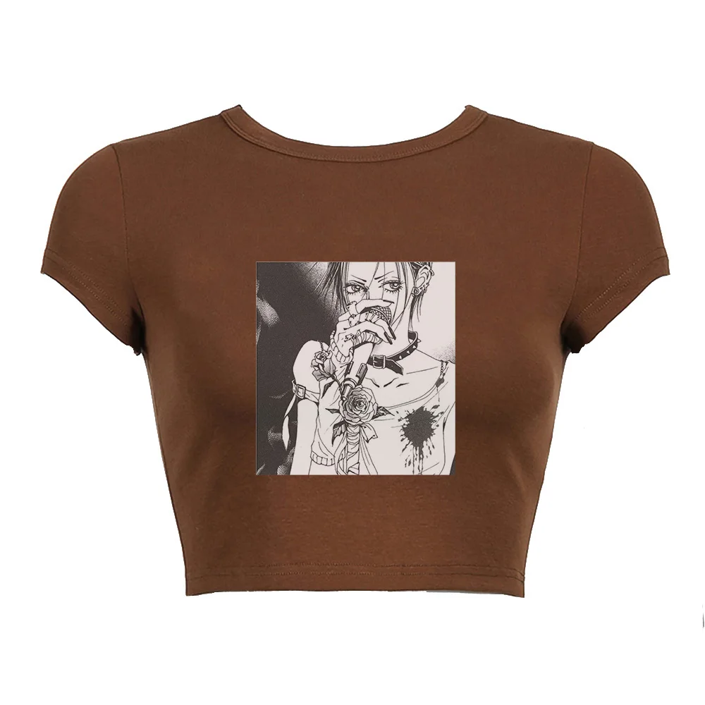 Черный корсет, топ с аниме-принтом, летняя женская футболка 2022, уличная одежда Нана Осаки манга Y2K, сексуальный панк, эмо, E-girl, облегающие кроп-топы