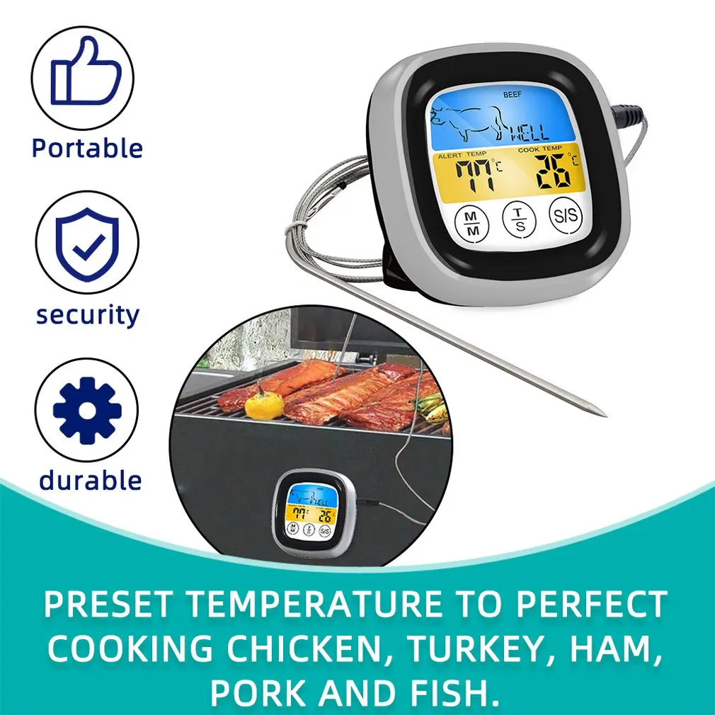 Цифровой кухонный термометр для мяса, кухонный измеритель температуры из нержавеющей стали, с щупом и сенсорным светодиодным дисплеем, для духовки, барбекю