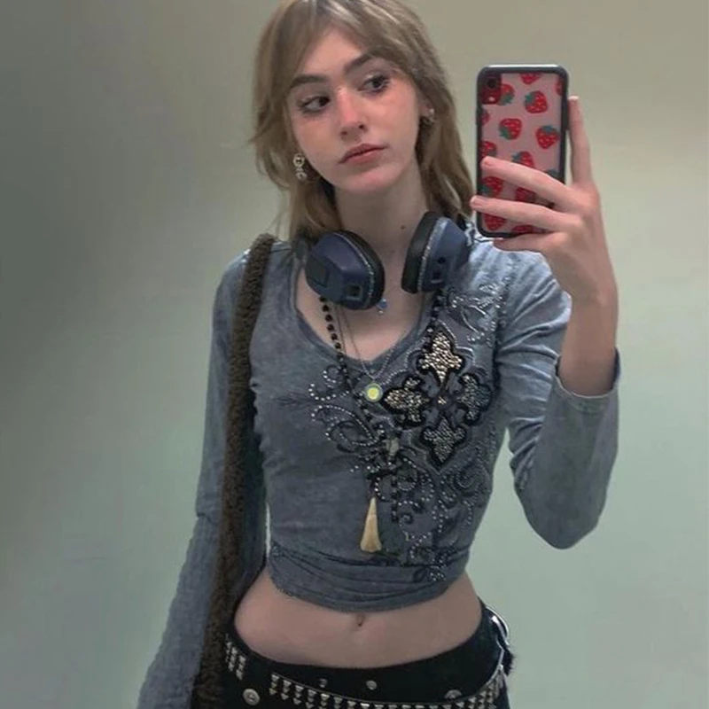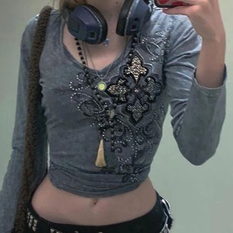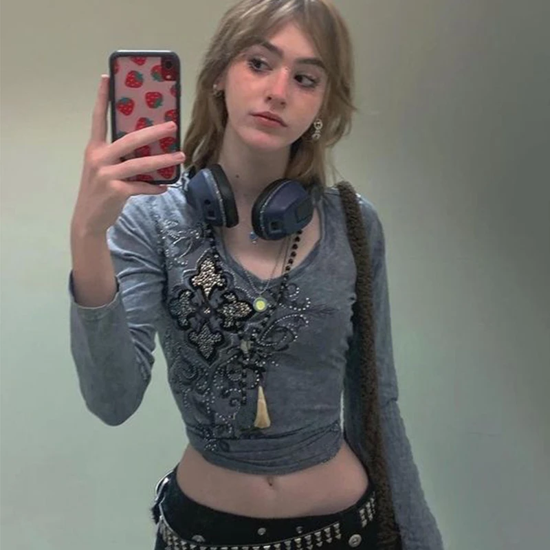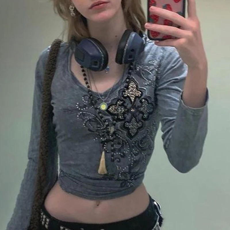 Футболка Xingqing в стиле 1920-х годов, футболка с графическим принтом и длинным рукавом, Ретро стиль, эмо, одежда для гранжа