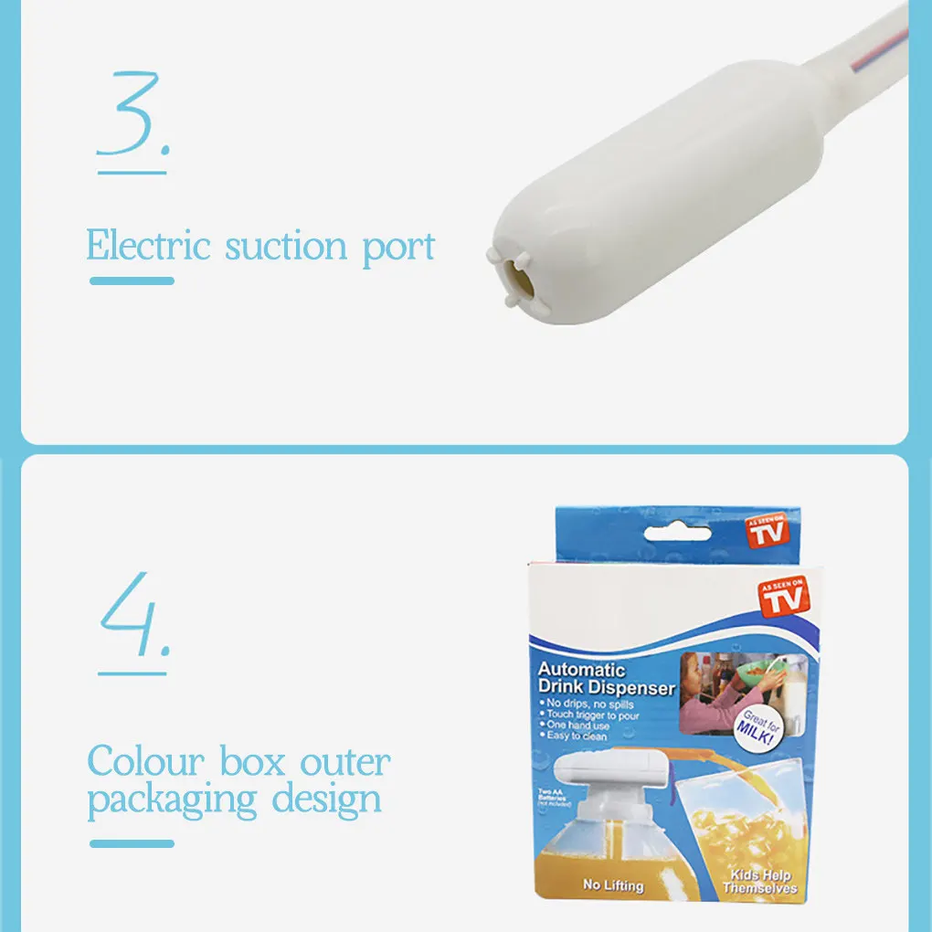 Описание: Электрический автоматический диспенсер для воды безопасен, безвкусный и прочный, что делает вашу жизнь более удобной. Устройство для перекачки напитков Подходит для большинства бутылок и кувшин и использует 2 батарейки АА. Электрический водяной насос, защищающий от разлива, должен только поместить распределительную трубку в бутылку для напитков и отрегулировать длину. Водяной насос эффективно предотвращает переливание, капание и отходы сока, молока и т. д. Затяните крышку и нажмите на триггер. Напиток будет автоматически отправлен. Вы можете легко прикоснуться к триггеру одной рукой, чтобы получить нужный вам напиток. Параметры: Размер: 345x62x112мм. Материал: АБС + ПП + силикон. Цвет: синий, белый. Аккумулятор: 2 батареи AA. (не входят в комплект) Примечание: Из–за разных компьютерных разрешений может быть небольшое цветовое искажение. Возможны незначительные погрешности из-за различных ручных измерений.