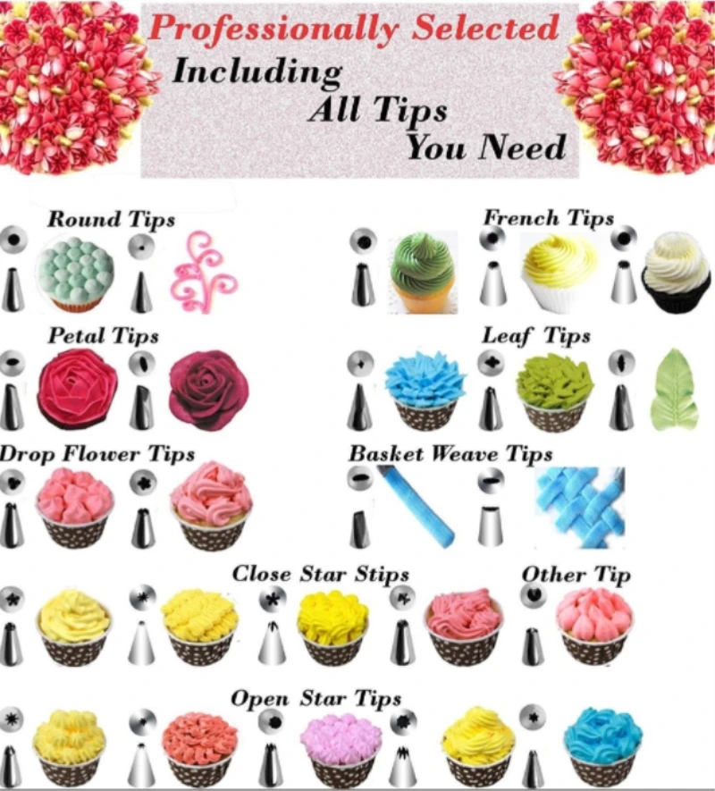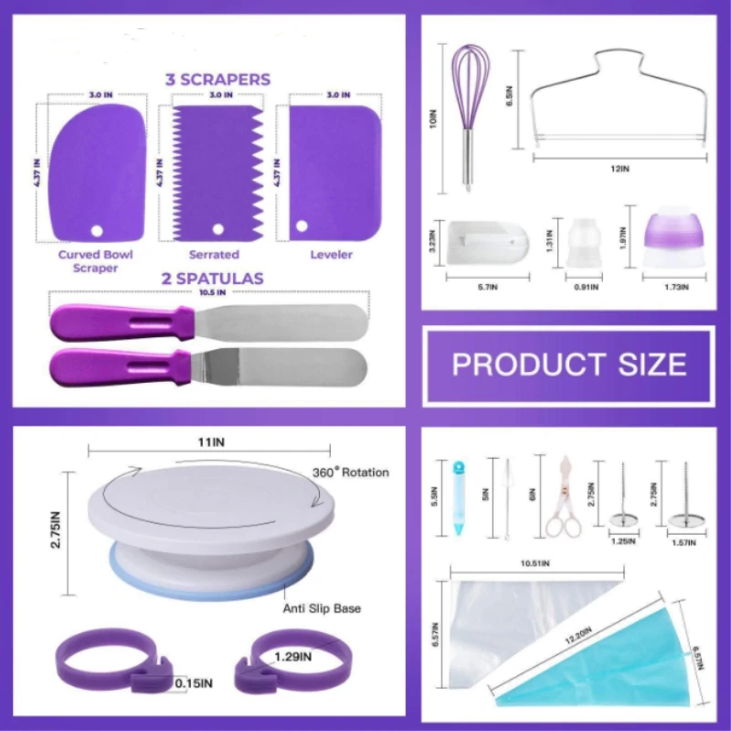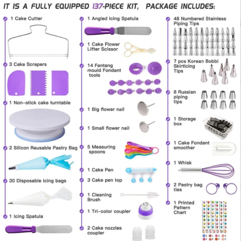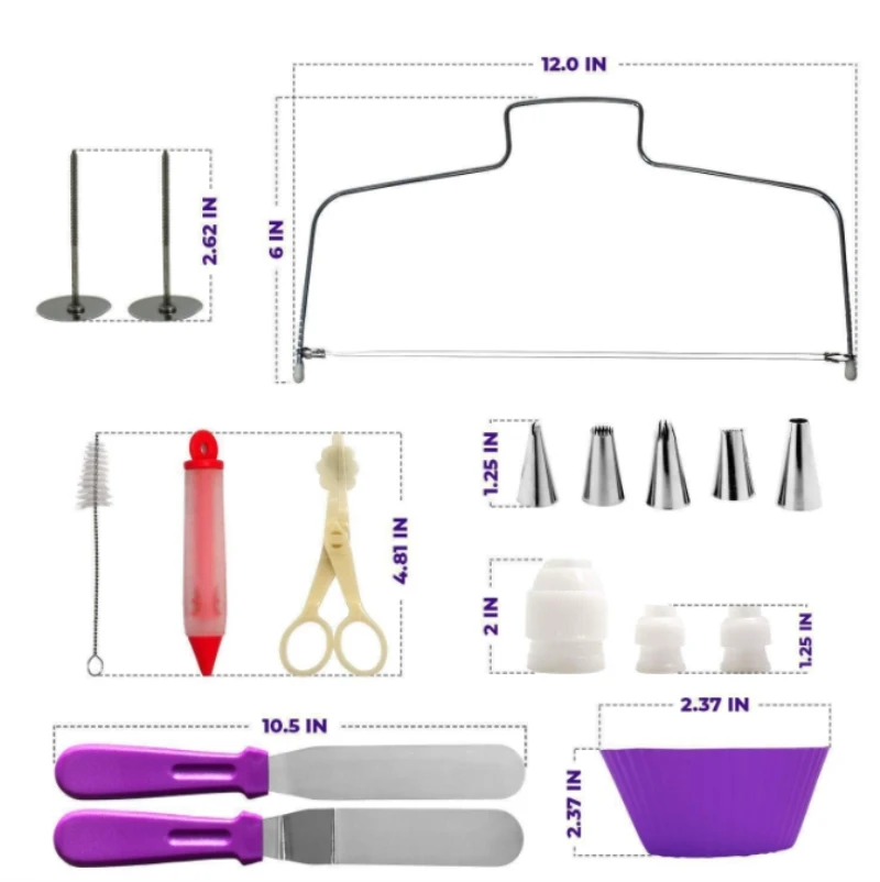 1 поворотный стол для торта + 48 наконечников для глазури из нержавеющей стали с 1-48 цифрами + 6 больших наконечников для глазури с 1-6 цифрами + 1 12 дюймовые многоразовые Кондитерские пакеты + 1 14 дюймовые многоразовые Кондитерские пакеты + 1 кисть для смазывания торта + 1 резак для торта + 1 ручка для торта + 3 скребка для торта + 2 насадка для пирожных маленькая муфта + 1 насадка для пирожных большая муфта + 25 одноразовых мешков + 1 глазурь Шпатель (27 см) + 1 угловой глазурный шпатель- (27 см) + 2 цветочных ногтя + 1 подъемник для торта + 12 шт. кексов