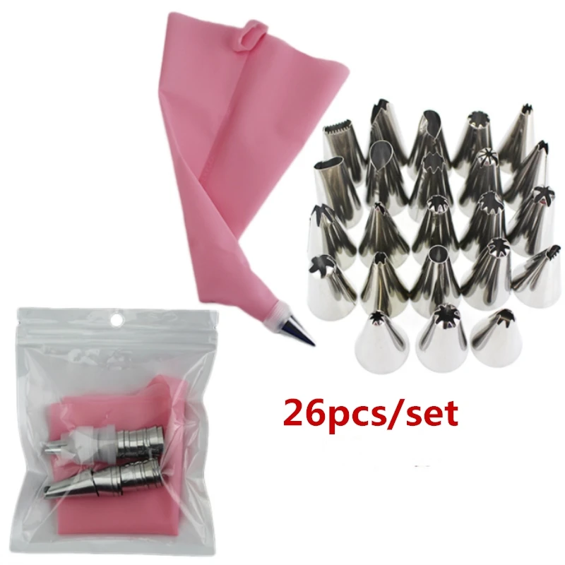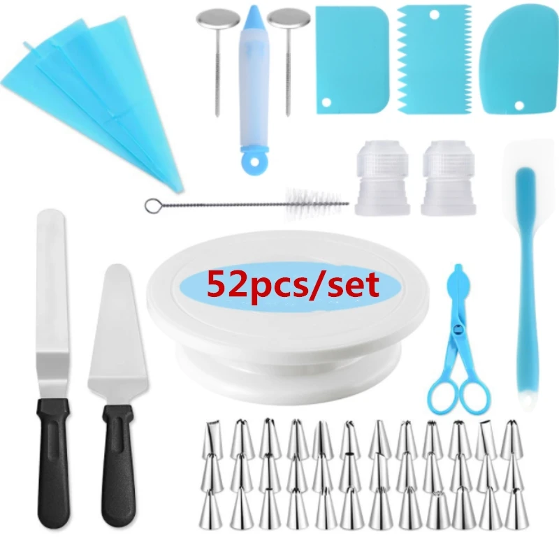 1 резак для торта + 3 скребка для торта + 1 антипригарный поворотный стол для торта + 2 силиконовых многоразовый кондитерский мешок + 30 одноразовый для глазури пакетов + 1 глазурный шпатель + 1 угловой шпатель для глазури + 1 ножничный подъемник для торта + 14 fantang формы помадки инструменты + 1 большой цветок ногтей + 1 маленький Цветочный гвоздь + 5 мерных ложек + 1 ручка для торта + 3 ручки для торта + 1 щетка для очистки + 1 цветная муфта + 2 насадка для пирожных муфта + 48 наконечников для глазури + 7 шт. Корейская юбочка для Бобби 8 наконечников для русских трубопроводов + 1 кондитерский смокинг + 1 венчик + 2 кондитерских мешка Галстуки