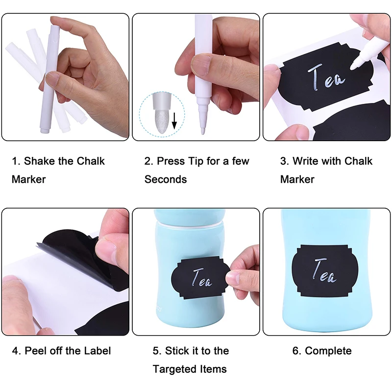 Широкий спектр использования:Водостойкие многоразовые этикетки для досок для банок, организации, маркировки банки для досок, печенья, консервирования, желейных банок, банок для специй, флаконов для распыления, бутылок для воды или шейкера, бокалов для вина, оловянные коробки для кофе или чая, канистры, корзины, папки, офисные принадлежности. Ярлыки для досок для организации и декорирования являются хорошим выбором для кухонных этикеток для хранения в кладовой.