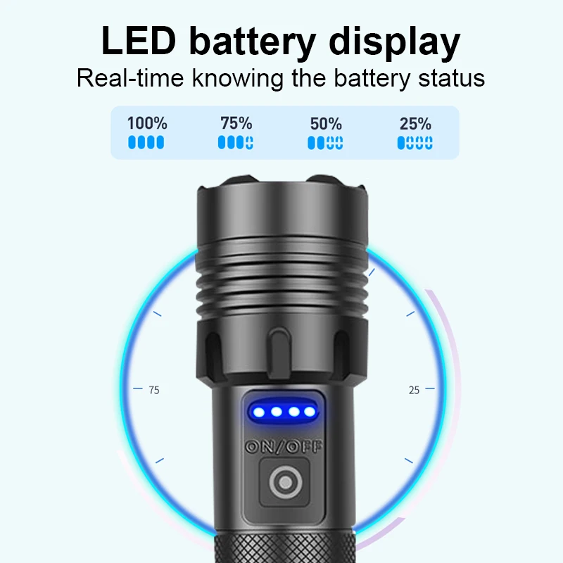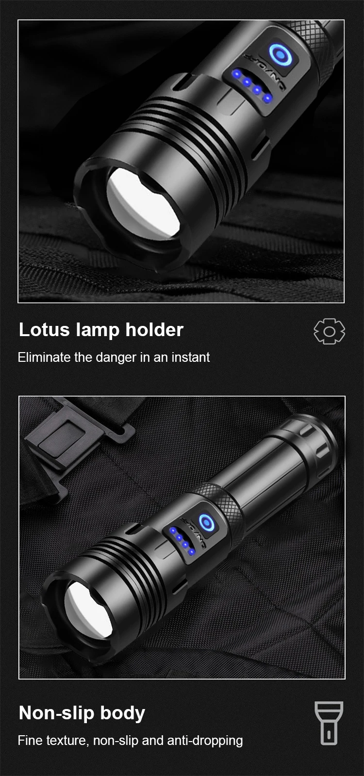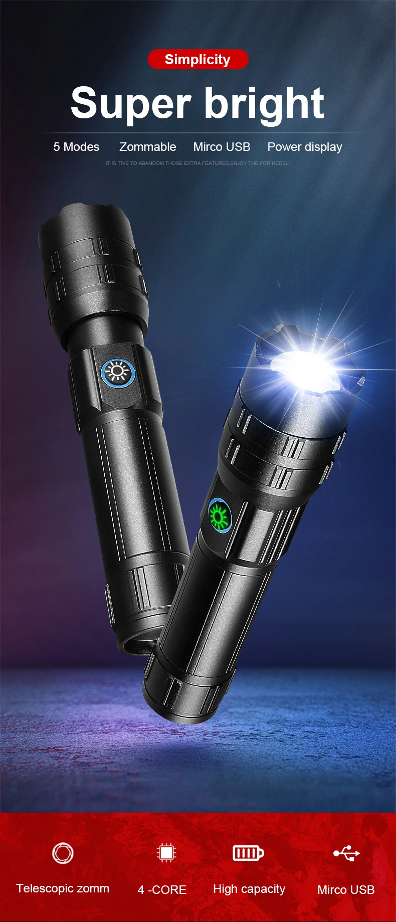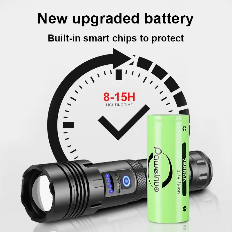 Range диапазон: 1600 метров❃Material: супер авиации Алюминий❃Waterproof Рейтинг: IPX-8Zoom Режим масштабирования: телескопический зумLighting Время освещения: 1*18650 аккумулятор 8 часов; 1*26650 аккумулятор 15 часов❃Размер (см): 17,4*4,3*3,5 см❃Метод зарядки: быстрая зарядка через USB (вход и выход, с функцией мобильного питания, можно заряжать мобильные телефоны)Suitable подходит для ночного кемпинга, рыбалки, работы, охоты, пеших прогулок, катания, приключений и т. д.