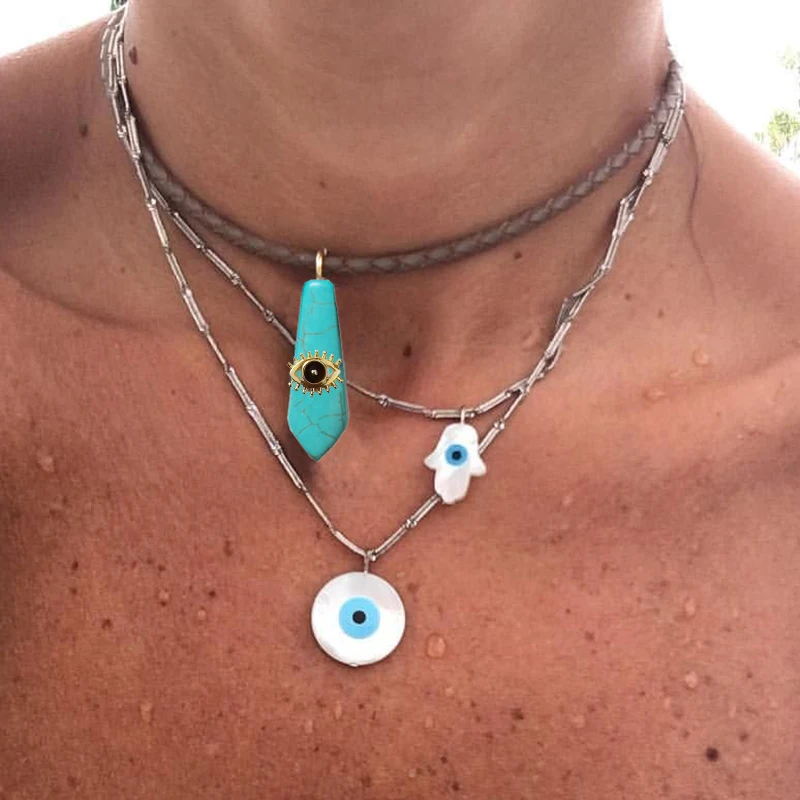Драгоценный камень амулеты воротник классический оптовая продажа нагрудник сглаза голубой бирюзовый камень кулон кожаные ожерелья для женщин женские ювелирные изделия