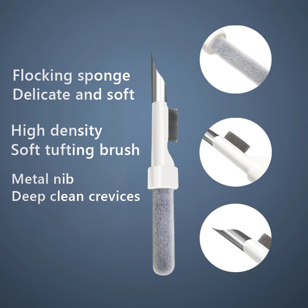 Отдельный дизайн с двойной головкой. Различные функции очистки, флокирующая губка позволяет очистить зарядное устройство для гарнитуры; Флокирующая головка высокой плотности позволяет очистить звуковое отверстие для наушников, Сетчатое отверстие, отверстие для микрофона на мобильный телефон и отверстие для звука; металлический наконечник позволяет эффективно удалять упрямые пятна.