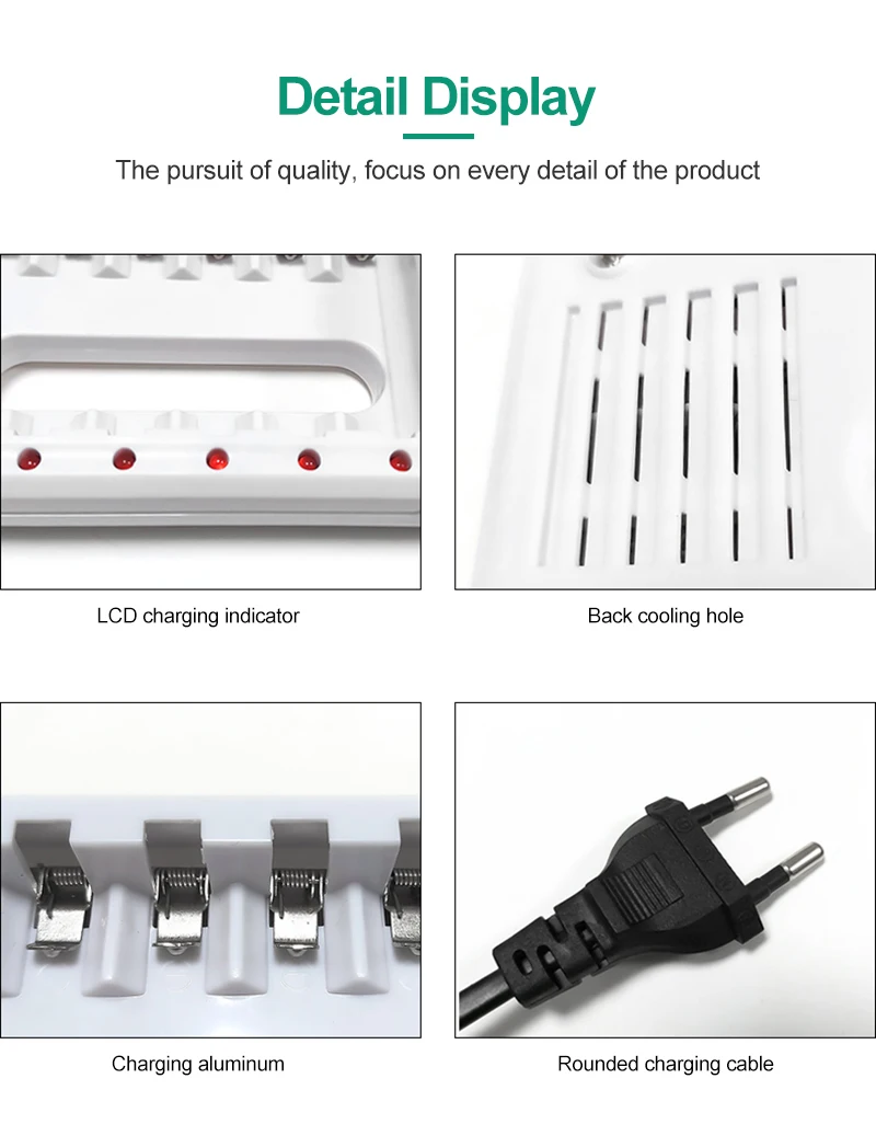 Особенности:Предназначен для аккумуляторов AA / AAAЭто зарядное устройство с 8 слотами может заряжать 2,4,6,8 батарей одновременно, удобно и легко заряжать.