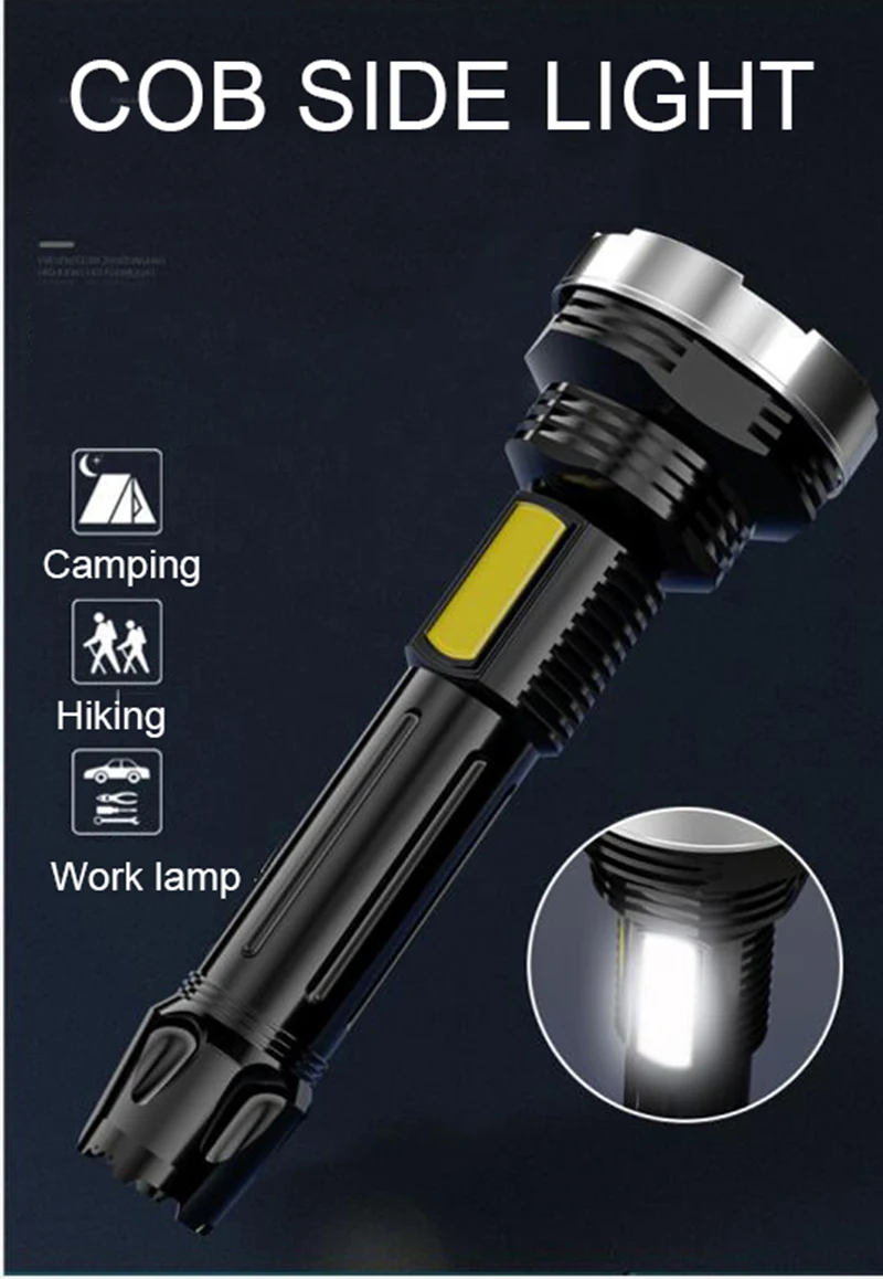 Яркий светодиодный + COB фонарик, 4 режима, водонепроницаемый, USB Перезаряжаемый фонарь, портативный, мощный, со встроенной батареей, для кемпинга на открытом воздухе