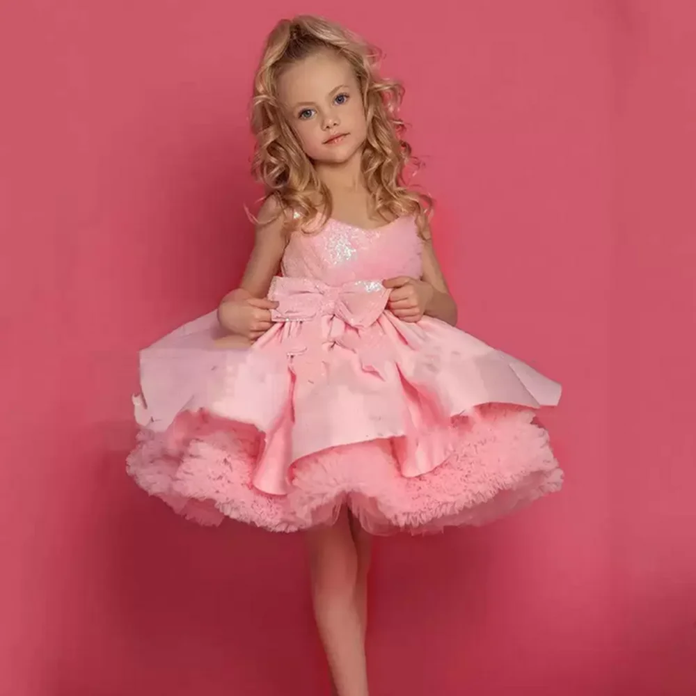 Милое розовое платье принцессы с цветами для девочек, детские платья на день рождения и вечеринку, платья с блестками для первого Дня Святого Причастия