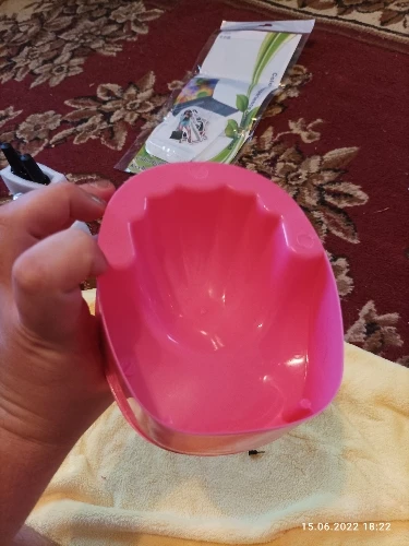 Ванночка удобная, как в описании, соответствует заявленному, цвет в точности такой же как у продавца,под небольшую и руку и руку побольше подходит. Будет удобно отмачивать кутикулу пед удалением. Или ноготочки например отбелить. Для всех манипуляций такого плана, очень неплохо. Лёгкая, есть петля для подвешивания. Рекомендую товар и продавца!