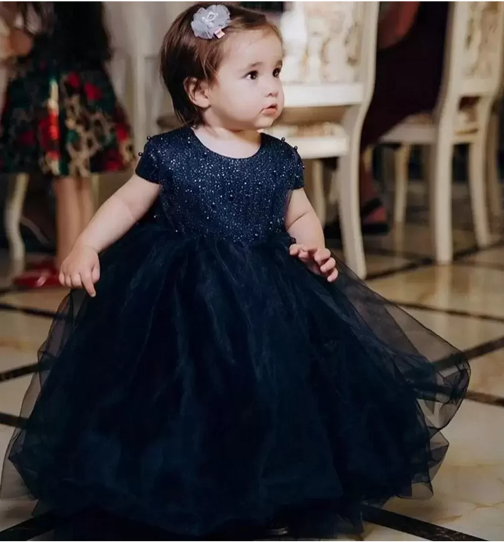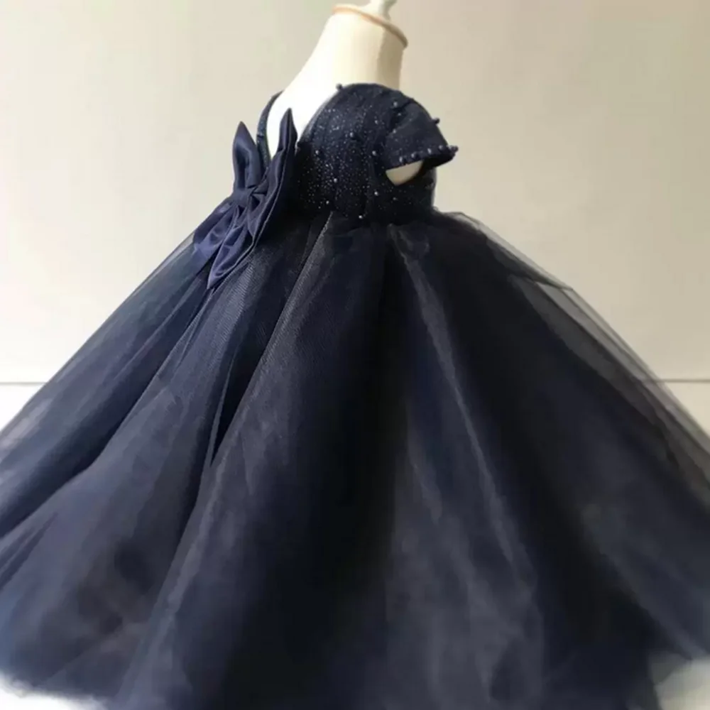2022 темно-синие платья для девочек с жемчугом и цветочным принтом, небольшие платья из тюля с открытой спиной для свадьбы, причастия, наряды