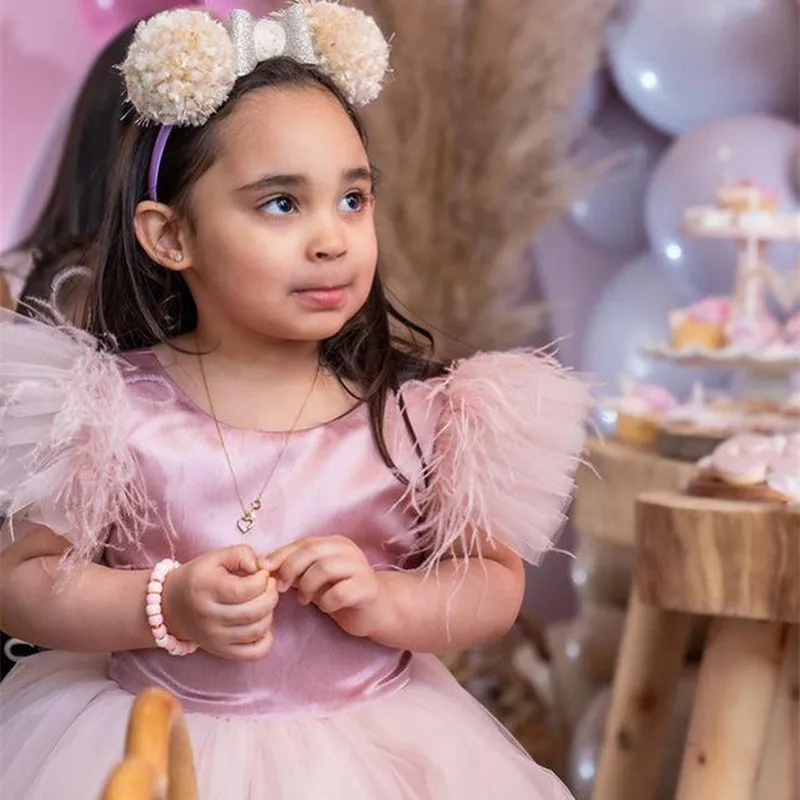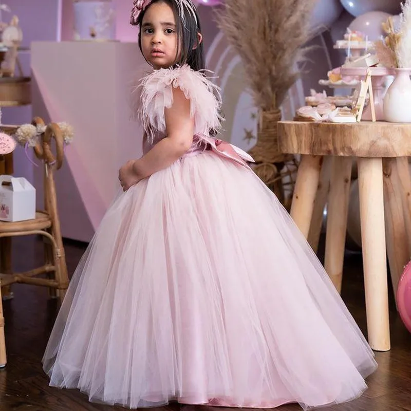 Простые розовые платья с цветами для девочек, тюлевые платья с перьями, Детские Свадебные платья на день рождения
