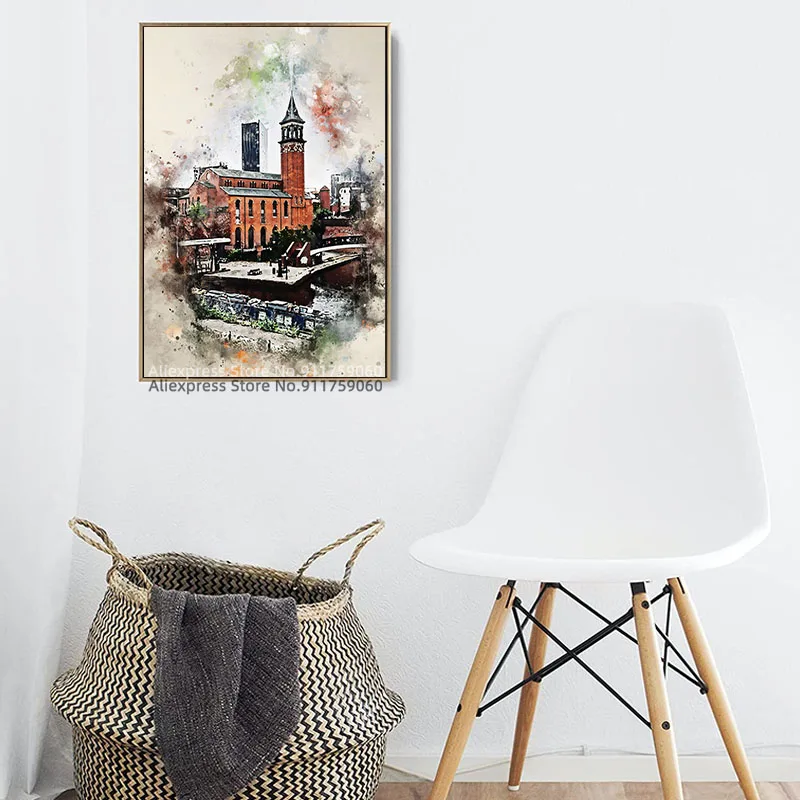 Акварель городской пейзаж Манчестера, Великобритания, искусство, холст, живопись, принты, настенные картины, плакат для дома