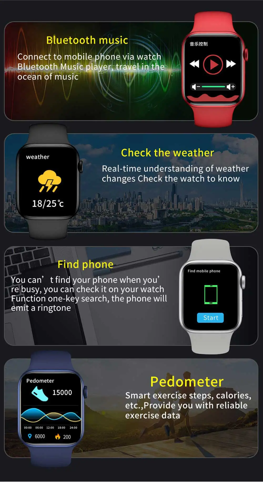 Характеристики:Этот номер модели часов T900, не оригинальные часы iwo, пожалуйста, обратите вниманиеПоддержка bluetooth вызова, пульс, обмен 44 мм apple watch ремешок, bluetooth музыка, всего 12 различных лиц, могут таможня часы лица,Чип: MTK2502 Поддержка Bluetooth 3,0, 4,0, 5,0Основной экран 1,71 дюйма HD IPS, 360*360Сенсорный экран 2.5D поверхность лисы емкостный полноразмерный сенсорный экранBluetooth pushSMS WeChat QQ новости и другая информация о клиенте и другие своевременные напоминанияМониторинг сердечного ритма, мониторинг сердцебиенияШагомер, Спортивная калория, потребление калорий, запись пробега упражненийНапоминание о малоподвижности, чтобы встать и изменить нездоровый образ жизниМониторинг сна объективная наука количественно записывает и анализирует состояние снаФункция «Найти мобильный телефон», функция «анти-потеря».Двусторонний Поиск Bluetooth управление воспроизведением музыки мобильное воспроизведение музыки Поддержка напоминания о звонкахХарактеристики батареи и емкость 240 мАч Высокая емкость полимера